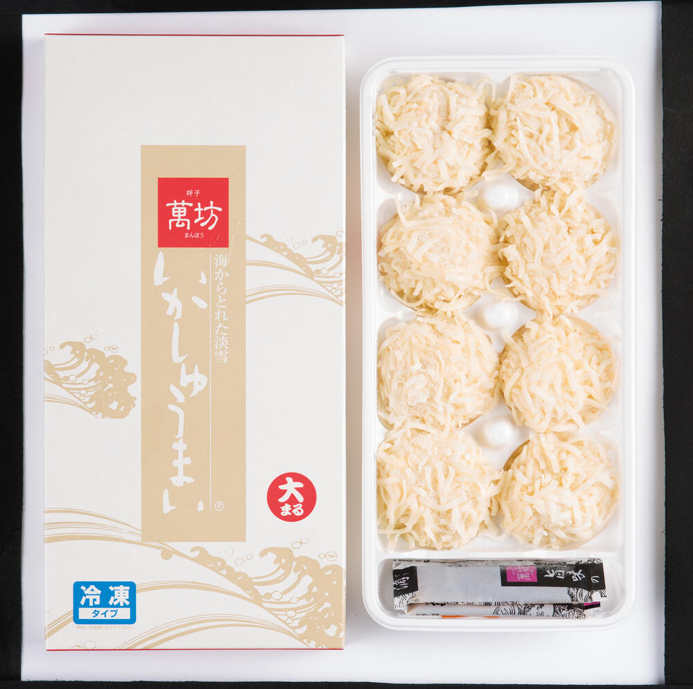 呼子名物「いかしゅうまい」の元祖。いかしゅうまいの故郷は、朝市やいか活き造りで有名な佐賀県唐津市呼子町。海中レストラン「蔓坊」で生まれました。イカは生のままでは1日も持たない繊細な魚介です。使い切ろうとしても季節や天候にとって余ってしまうことも。そこでイカを無駄にしたくないという料理人の思いから生まれたメニューのひとつが「いかしゅうまい」です。萬坊の「いかしゅうまい」は、ほとんどの工程を手作業で行っています。プリプリと弾むイカの上身だけを贅沢に使用し、産地限定の玉ねぎや、こだわりの卵、海塩【一の塩】を加えて丁寧に織り込みました。いかしゅうまいは萬坊一番人気の贈り物です。自慢の味や風味をぜひお楽しみください。(4560169146002)
