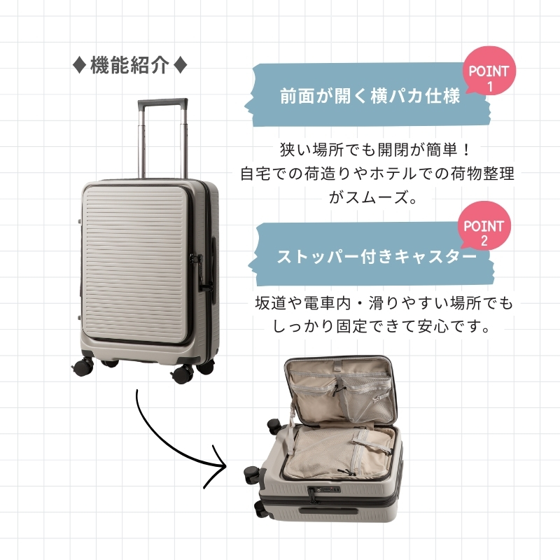 狭い空間でもスマートに開閉が可能な横パカ機能が備わっており、自宅での荷造りやホテルでの荷物の出し入れが簡単にできます。