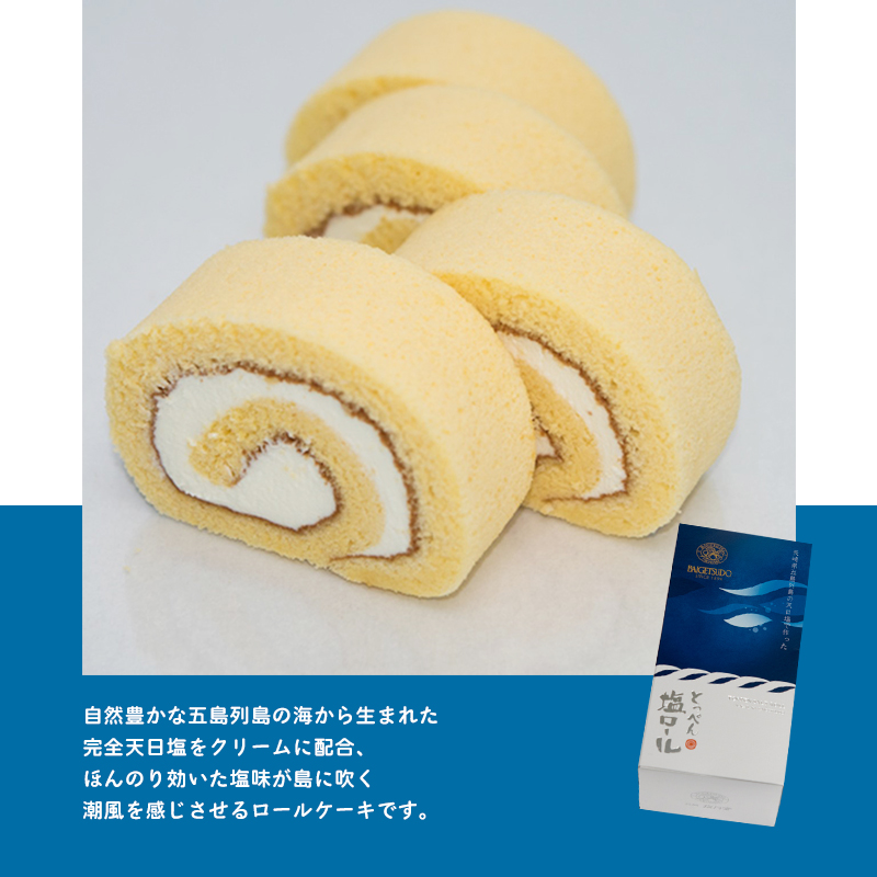 生地に長崎県産の小麦粉と鶏卵を使い、中のクリームには五島列島の「とっぺん塩」を配合した新食感のロールケーキ「とっぺん塩ロール」