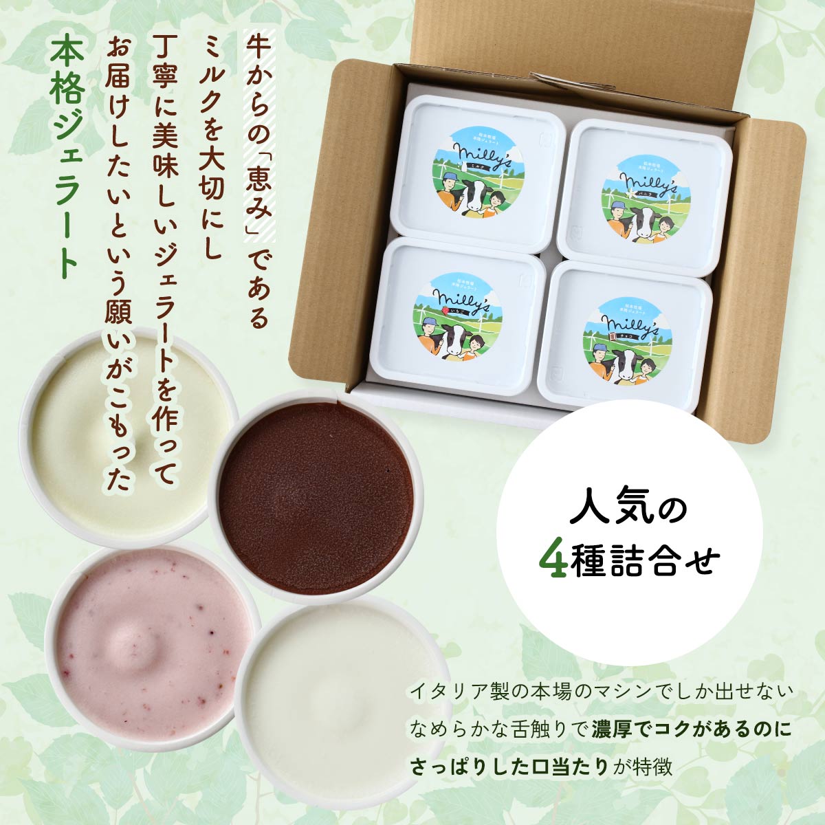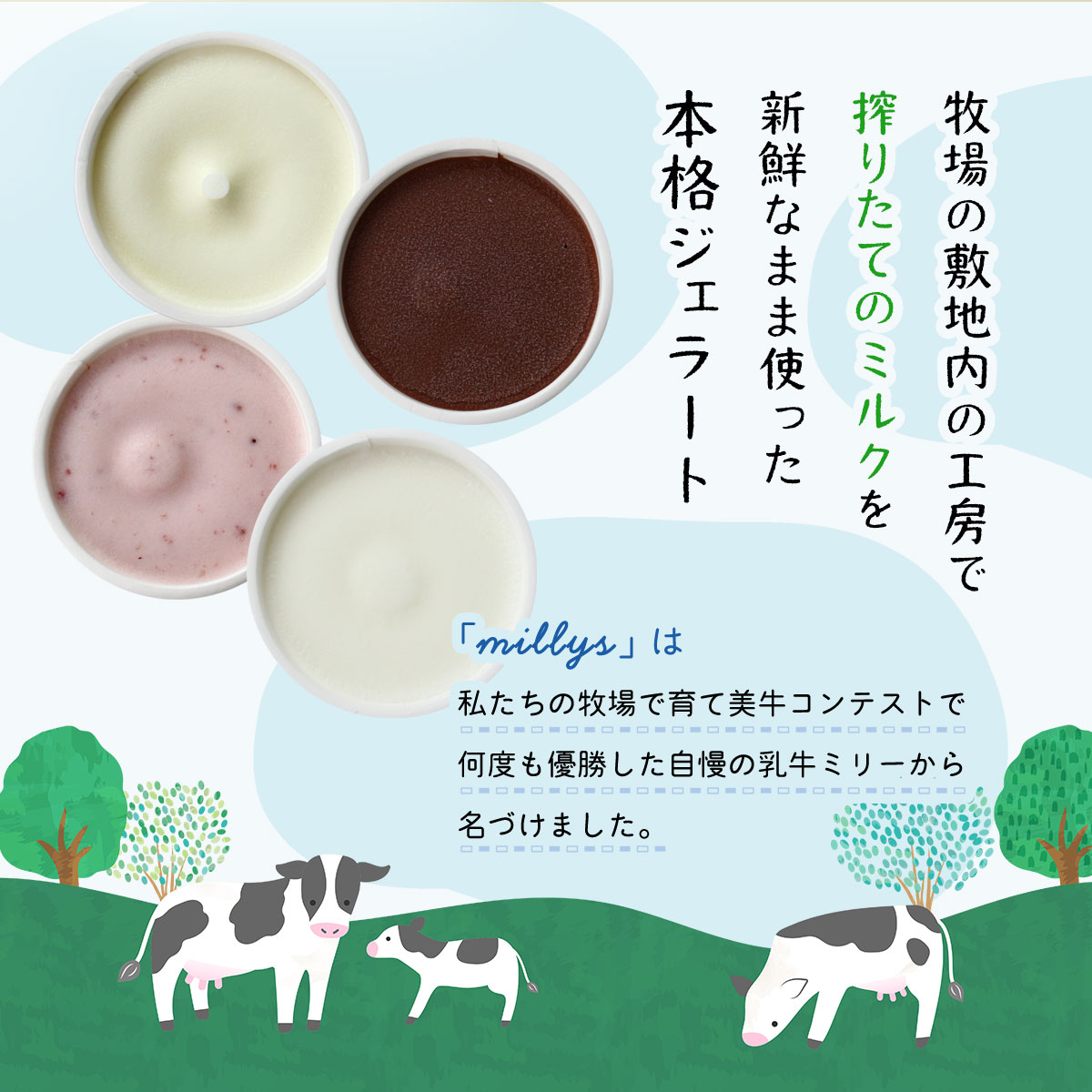 本格ジェラート「ミリーズ」は、私たちの牧場で育てた牛のミリーから名づけました。