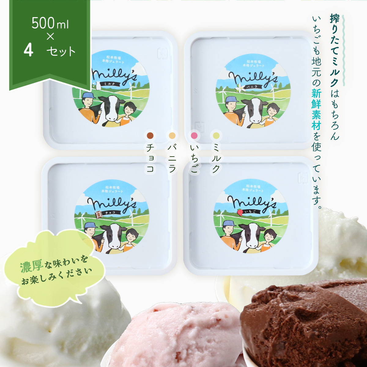 松本牧場 本格ジェラート millys 500ml×4個セット 商品番号23ky4990022539199