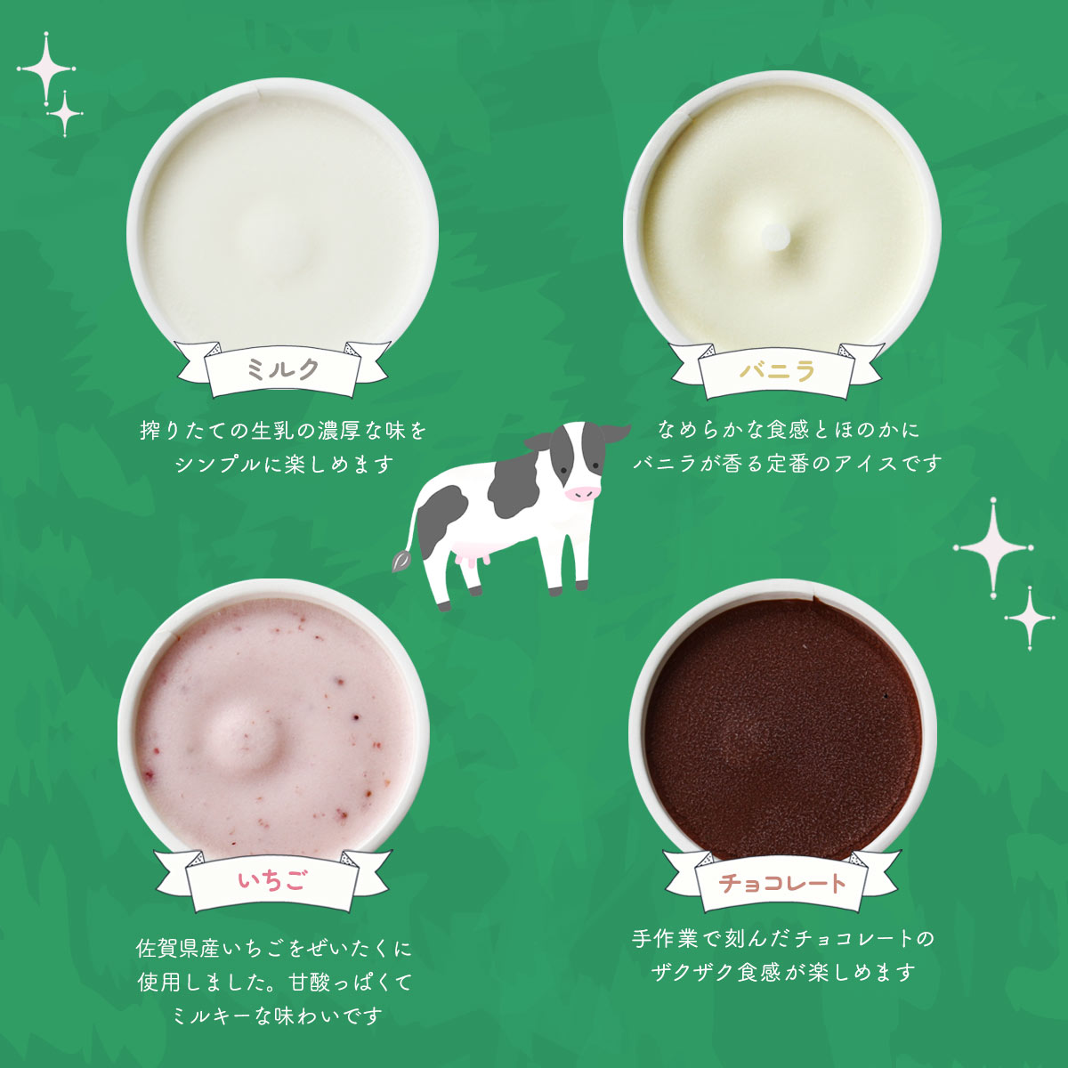 【ミルク】生乳(佐賀県産)、乳製品、グラニュー糖、ブドウ糖/トレハロース、乳化剤、安定剤(増粘多糖類)【バニラ】生乳(佐賀県産)、乳製品、グラニュー糖、ブドウ糖/トレハロース、乳化剤、安定剤(増粘多糖類)、香料【チョコ】生乳(佐賀県産)、乳製品、グラニュー糖、チョコレート、カカオパウダー、ブドウ糖/乳化剤(大豆由来)、安定剤(増粘多糖類)、香料【いちご】生乳(佐賀県産)、いちご、いちごピューレ、乳製品、グラニュー糖、ブドウ糖/トレハロース、乳化剤、安定剤(増粘多糖類)