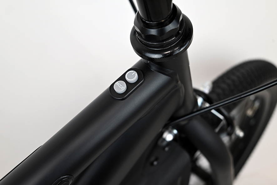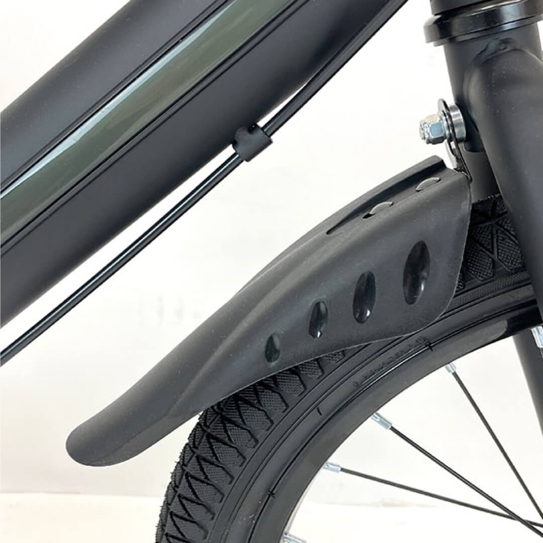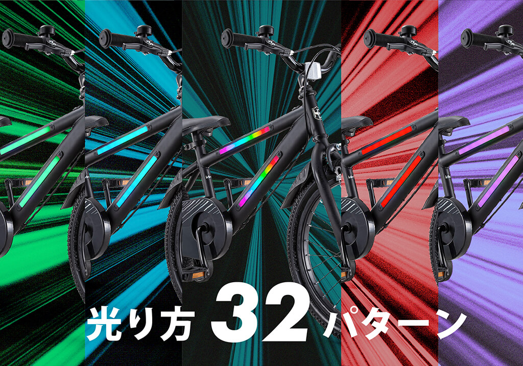 マットブラックの車体カラーに、虹色に輝くオーロラステッカーのロゴがアクセント。センスがきらりと光るかっこいいデザインで、昼間のお出かけもご機嫌に。
