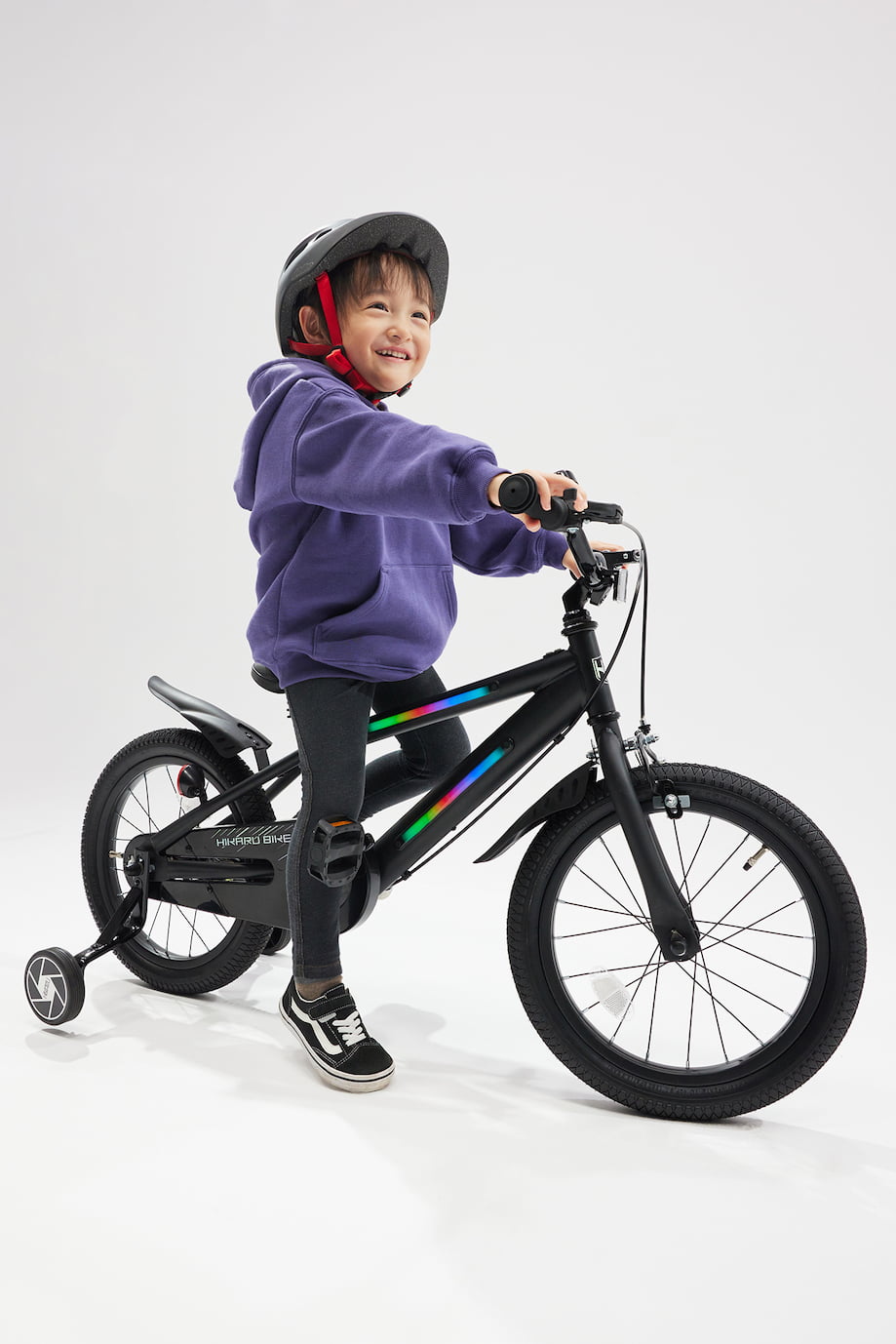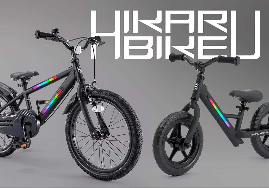 フレームにLEDライトが組み込まれた「光るバイク」シリーズは、「光るバイク(自転車)」16/18、「光るキックバイク」の2モデル・3サイズのラインナップ。きょうだいでおそろいも楽しめます。
