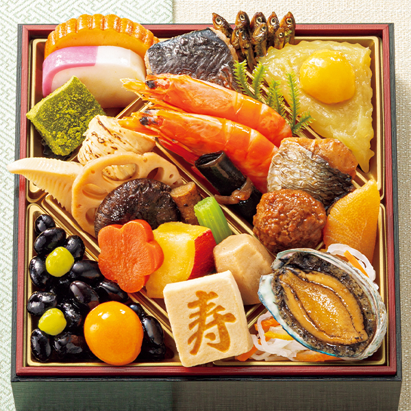 伊達巻、紅白かまぼこ、抹茶わらび餅、田作り、紅はるかきんとん、栗甘露煮、筍旨煮、湯葉巻、れんこん煮、椎茸煮、ごぼう煮、ふき煮、梅花人参煮、さつま芋レモン煮、里芋煮、さわら幽庵焼、祝い海老、一口昆布巻、にしん甘露煮(花椒風味)、純輝鶏鶏の肉団子、黒豆煮、うぐいす豆、金柑甘露煮、寿高野煮、紅白なます、あわび旨煮、味付数の子