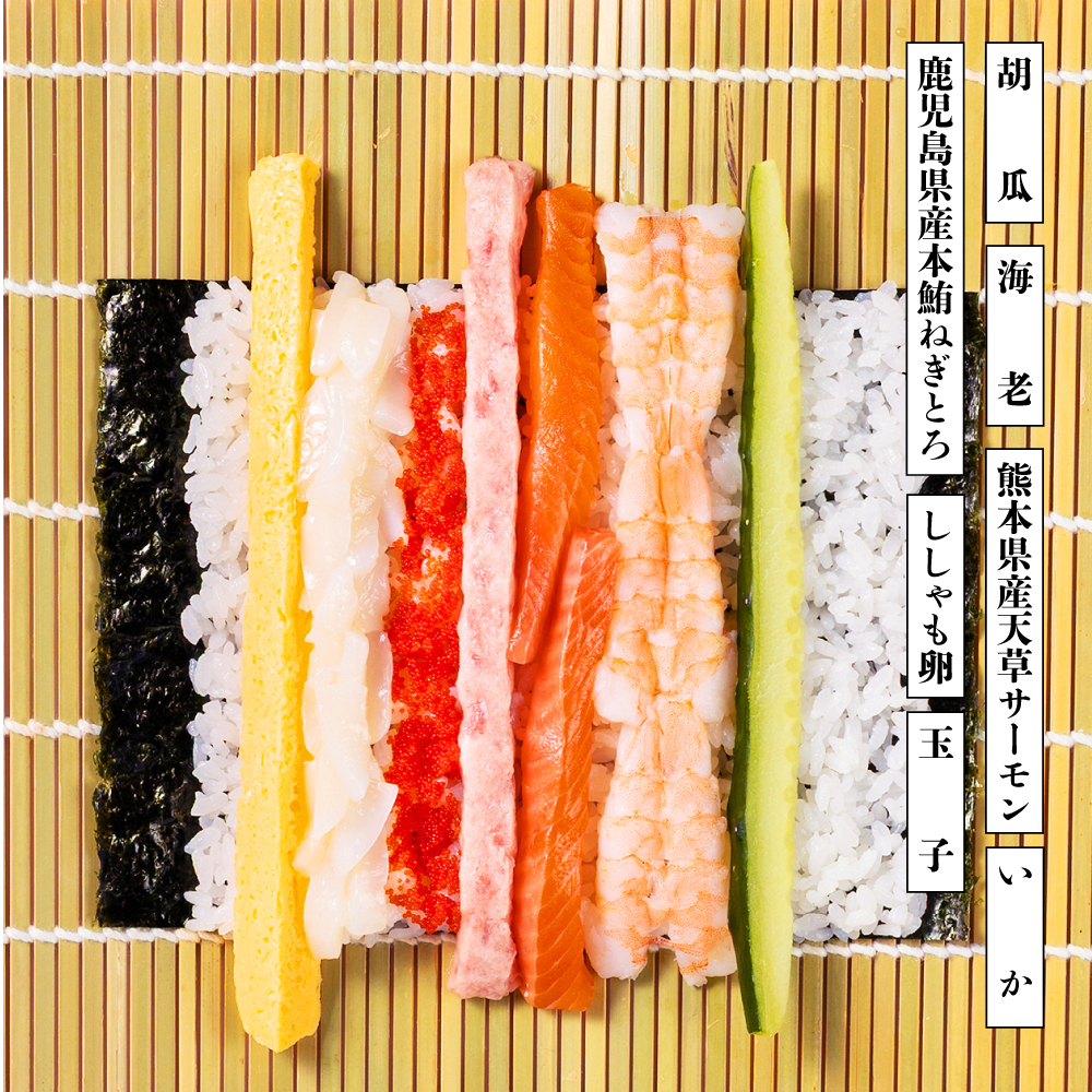 太巻1本【いか、海老、ししゃも卵、玉子、鹿児島県産本鮪ねぎとろ、熊本県産天草サーモン、胡瓜】