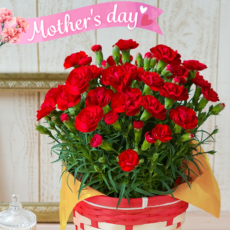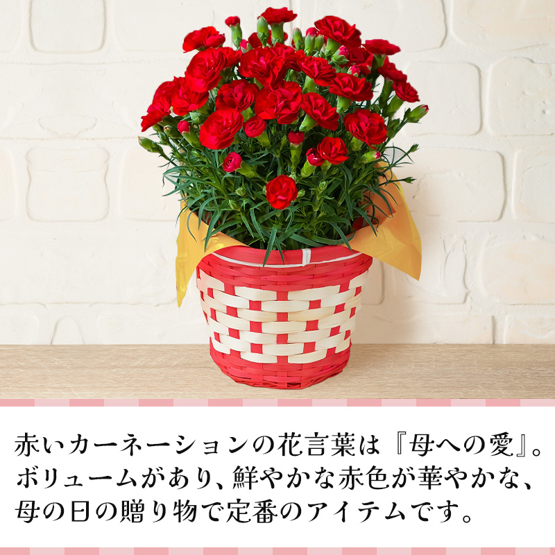 母の日の贈物で定番のアイテム。ボリューム感もあり、鮮やかな赤色が部屋に彩りをもたらします。赤いカーネーションの花言葉は『母への愛』。今なら感謝の気持ちを伝える『母の日メッセージカード』付いています。是非贈り物にいかがでしょうか。