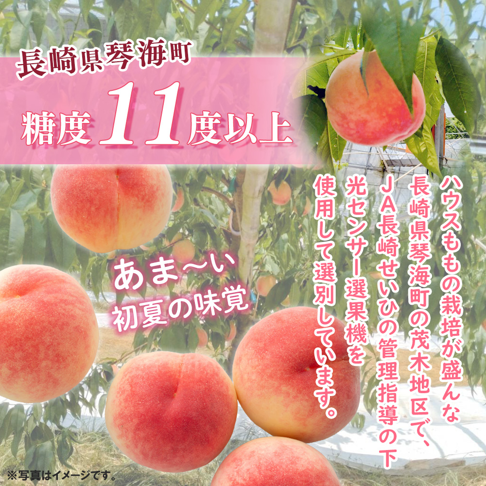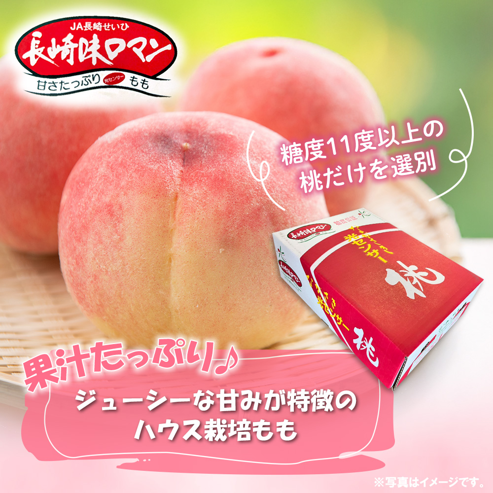 長崎県琴海、茂木地区はハウスももの栽培が盛んで、JA長崎せいひの管理指導の下光センサー選果機を使用し、糖度11度以上の桃だけを選別しています。さくひめ、白川白鳳を中心に6月上旬~中旬にかけて出荷されます。ジューシーな甘みが特徴のハウス栽培もも。初夏の味覚をお届けします。