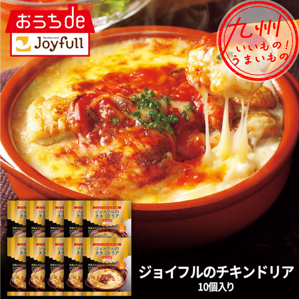 ジョイフルで長年にわたり愛されている人気のチキンドリアです。コクのあるホワイトソースと酸味の効いた特製トマトソースがとろ~り濃厚チーズと相性抜群。具材のジューシー鶏肉も美味。レンジ(600w)で5分あたためるだけでジョイフルのチキンドリアが美味しく出来あがります。