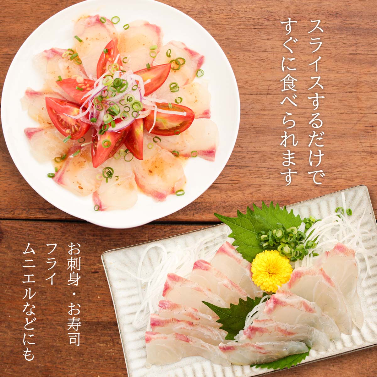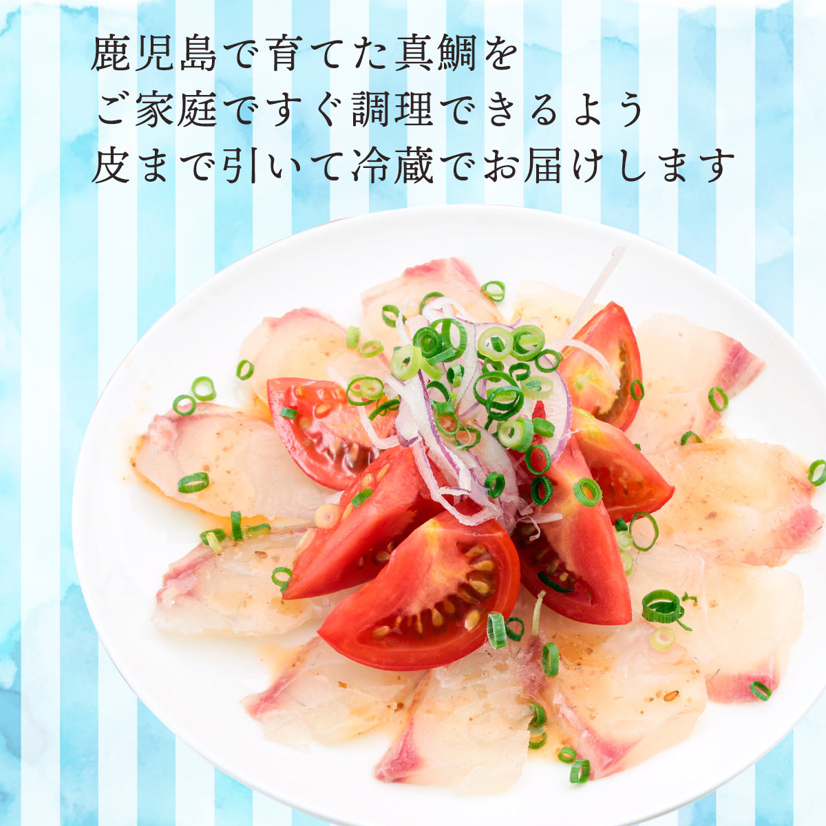 鹿児島県東町漁協の恵まれた自然環境とそこで培った漁師のこだわりで育てた真鯛を、ご家庭ですぐ調理できるよう、皮まで引いてパックしました。お刺身・お寿司・フライ・ムニエル、ご自由に調理できます。また、カルパッチョの具材としてや、お好きなお野菜と一緒にサラダにしたり、こだわりの真鯛の味を様々なお料理でお楽しみ頂けます。ぜひ一度ご賞味ください。
