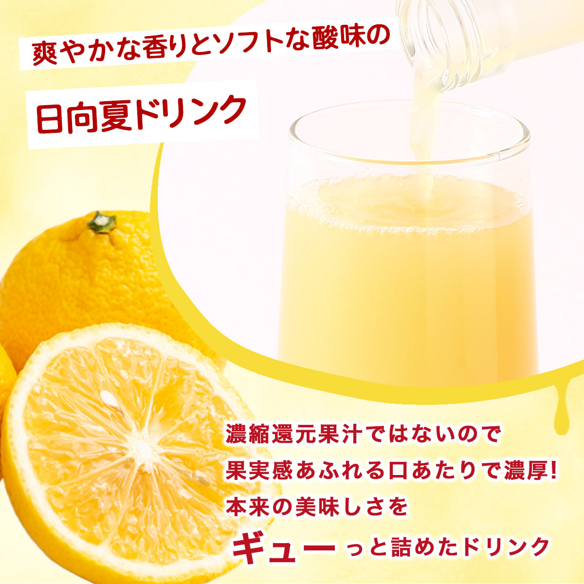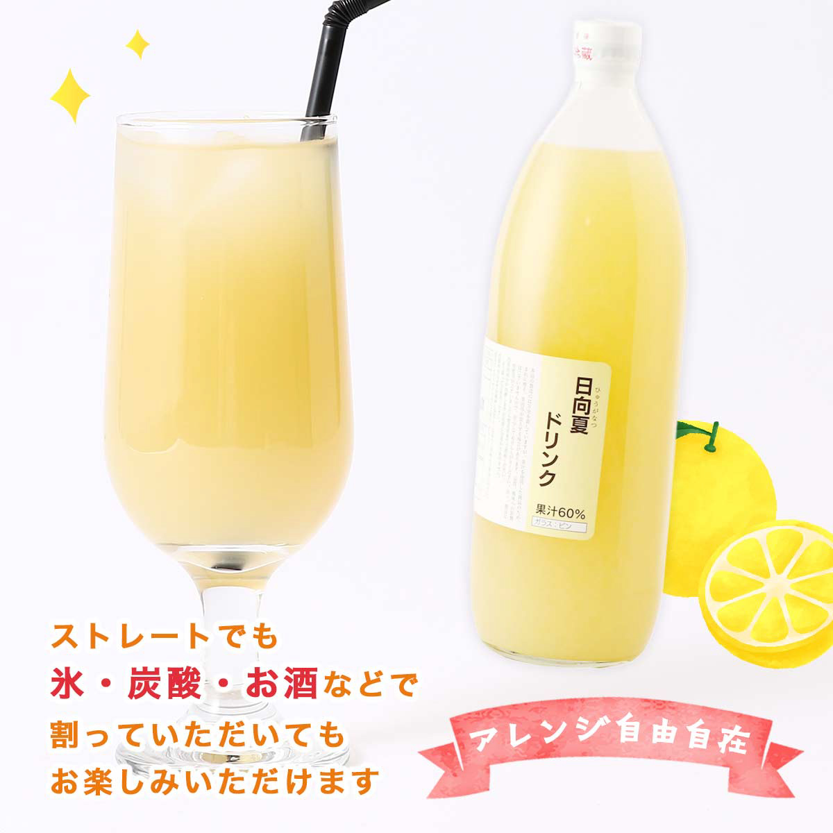 「日向夏(ひゅうがなつ)」は、宮崎県を代表する柑橘のひとつ。 爽やかな香りと、ソフトな酸味が特徴で、すっきりとした味わいが魅力です。 柑橘類では珍しく、リンゴのように皮をむき、白皮ごと食べられるのも日向夏ならでは。 ~アレンジも自由自在~ ・濃く感じる方は、水や氷で割ってすっきりと ・炭酸水で割れば、爽快なトロピカルスパークリングに ・お酒と合わせて、大人のカクテル風にもGood!