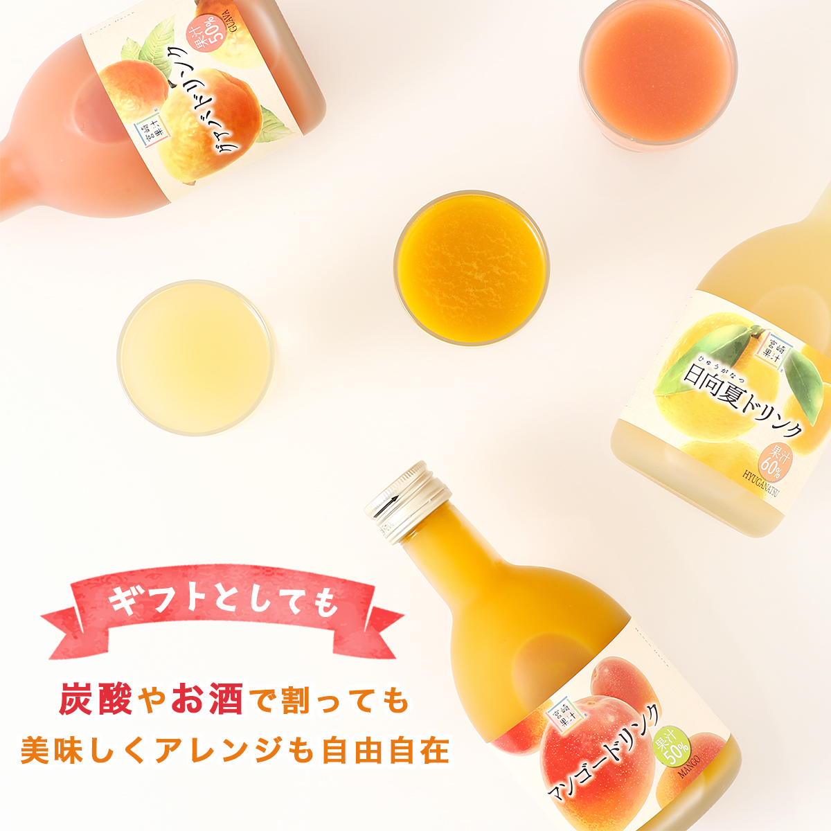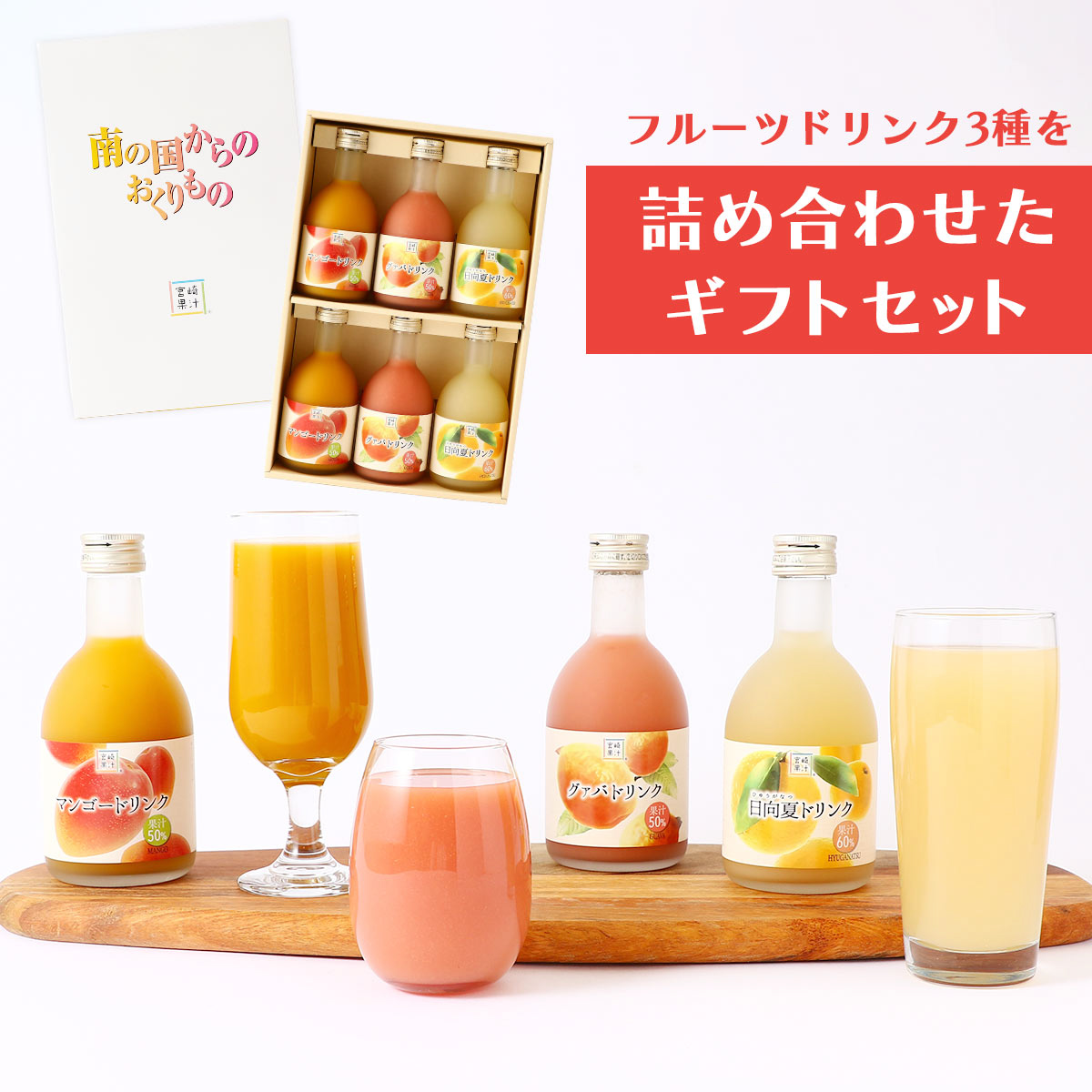 宮崎の自社農園で育てた果実を贅沢に使った、フルーツドリンク3種を詰め合わせたギフトセットです。 鮮やかな色合いと個性豊かな味わいは、まるで果実そのものを味わっているような満足感。 炭酸やお酒で割っても美味しく、アレンジも自由自在。 ご自宅用はもちろん、贈り物にもぴったりです。