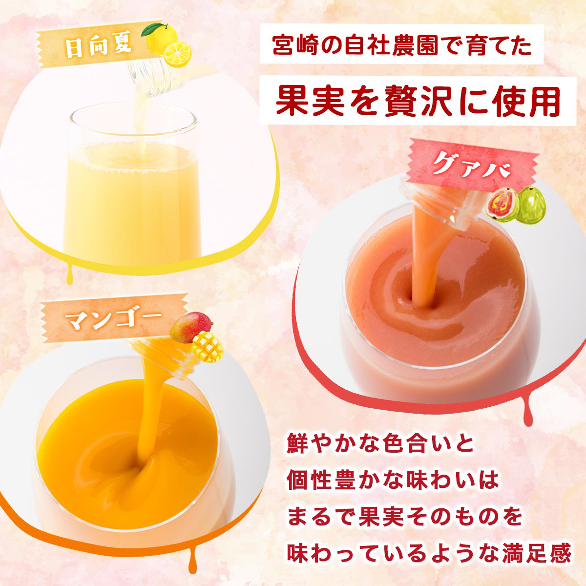 【グァバドリンク】グァバ(宮崎県産)、果糖、はちみつ 【マンゴードリンク】マンゴー(インド、宮崎県産)、果糖、はちみつ 【日向夏ドリンク】日向夏(宮崎県産)、果糖
