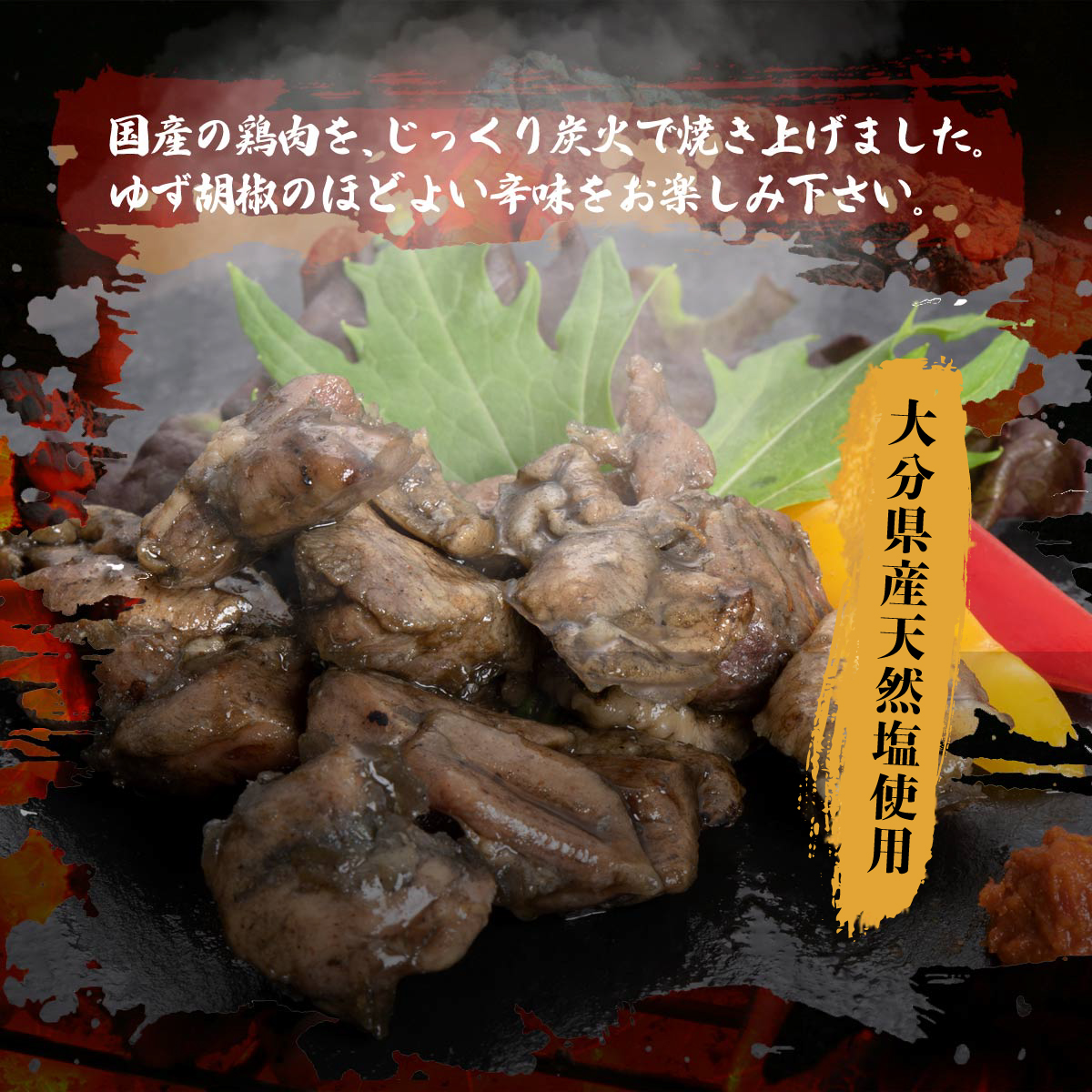 鶏肉(国産)、塩、醤油、おろしにんにく、唐辛子、植物油脂/調味料(アミノ酸)、(一部に小麦・大豆・鶏肉を含む)