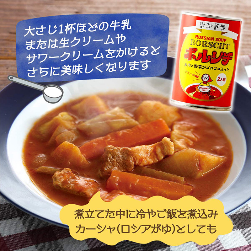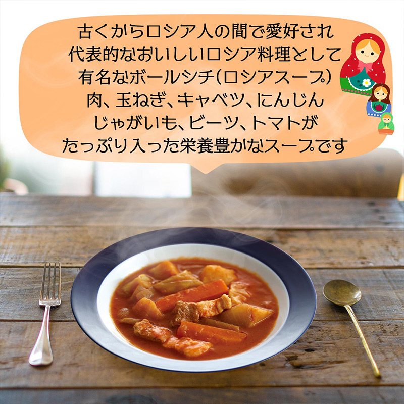 肉・玉ねぎ・キャベツ・人参・ジャガイモ・ビーツ・トマトのたっぷり入った栄養豊かなスープで四季を通じご家族のお食事はもとより、登山ハイキングにいつでも、どこでも、インスタントに召しあがることができます。