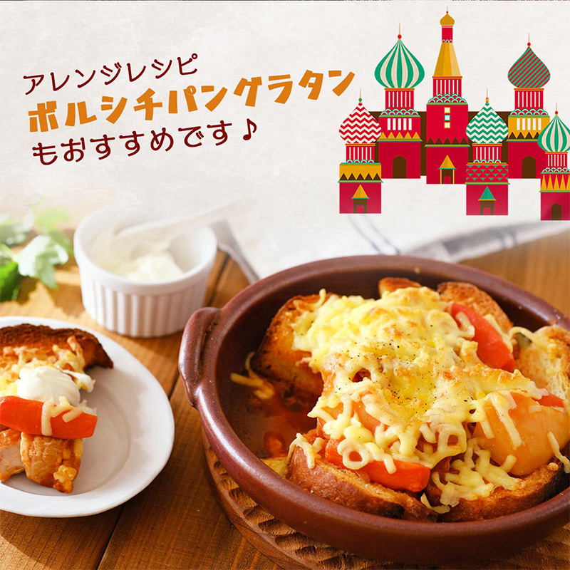 じゃがいも(中国)、たまねぎ、キャベツ、豚バラ肉、にんじん、トマトペースト、ビーツ、ビーフエエキス、小麦粉、フォンドヴォー、動物たん白加水分解物、食塩、ラード、醸造酢/調味料(アミノ酸)、安定剤(加工デンプン)、(一部に小麦、牛肉、豚肉を含む)