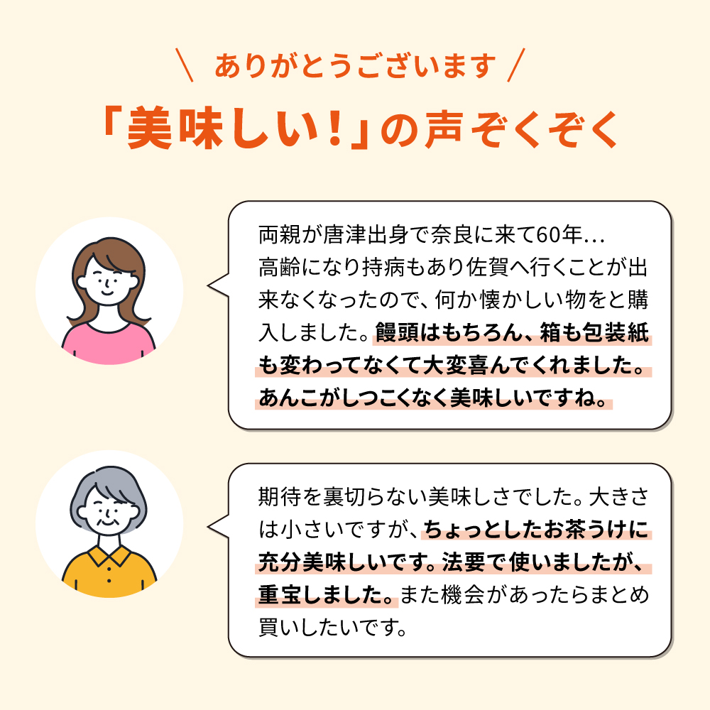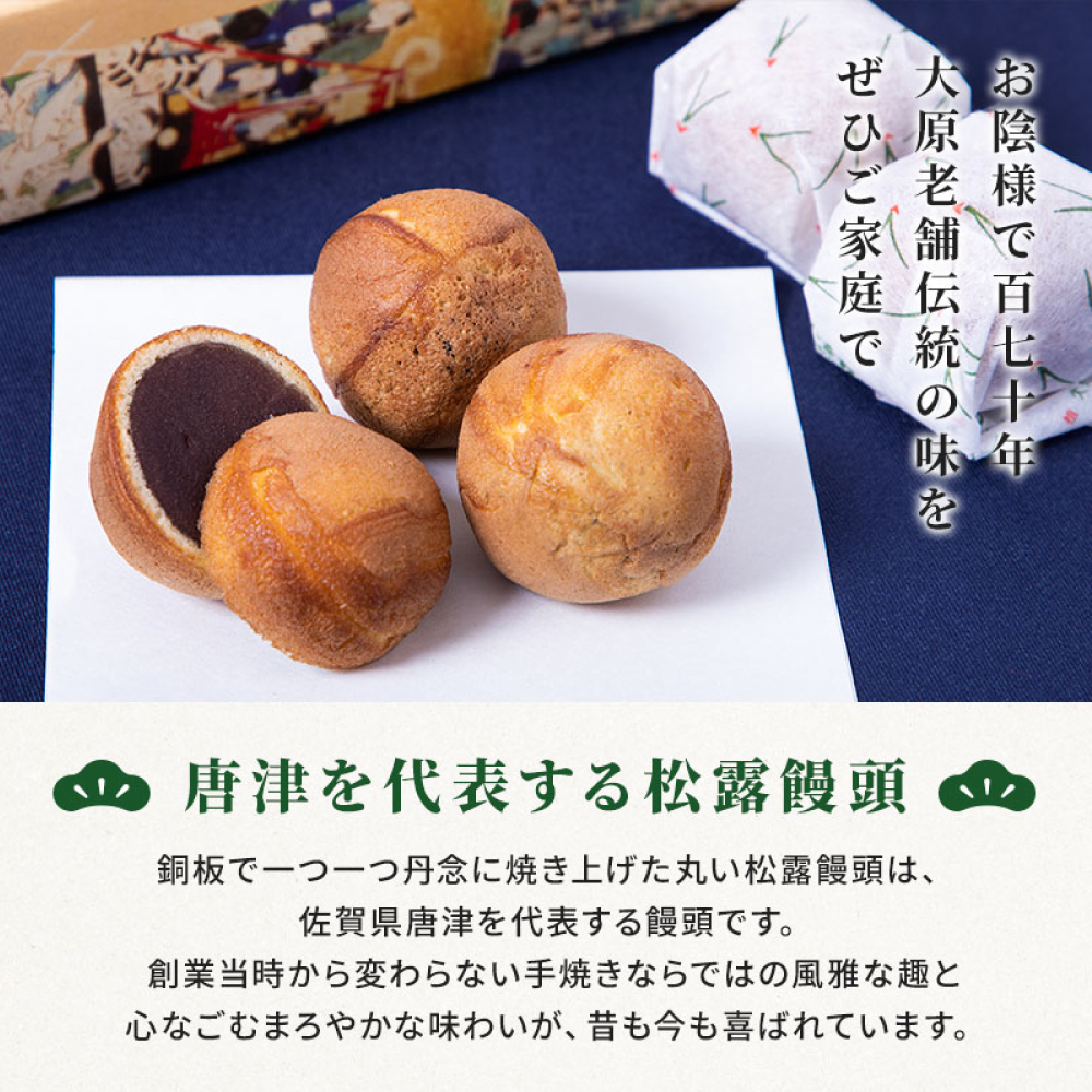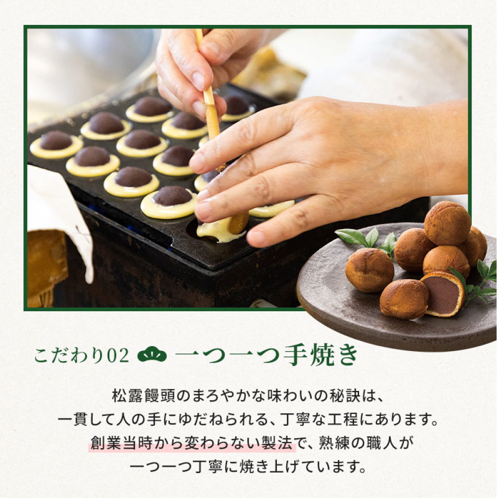 銅板で一つ一つ丹念に焼き上げる丸い松露饅頭は唐津を代表するお土産の饅頭です。あっさりした味のこしあんを薄いカステラ生地に包んで焼き上げています。この「手作りのおいしさ」と手焼きならではの風雅な趣きと心なごむまろやかな味わいをぜひご堪能ください。