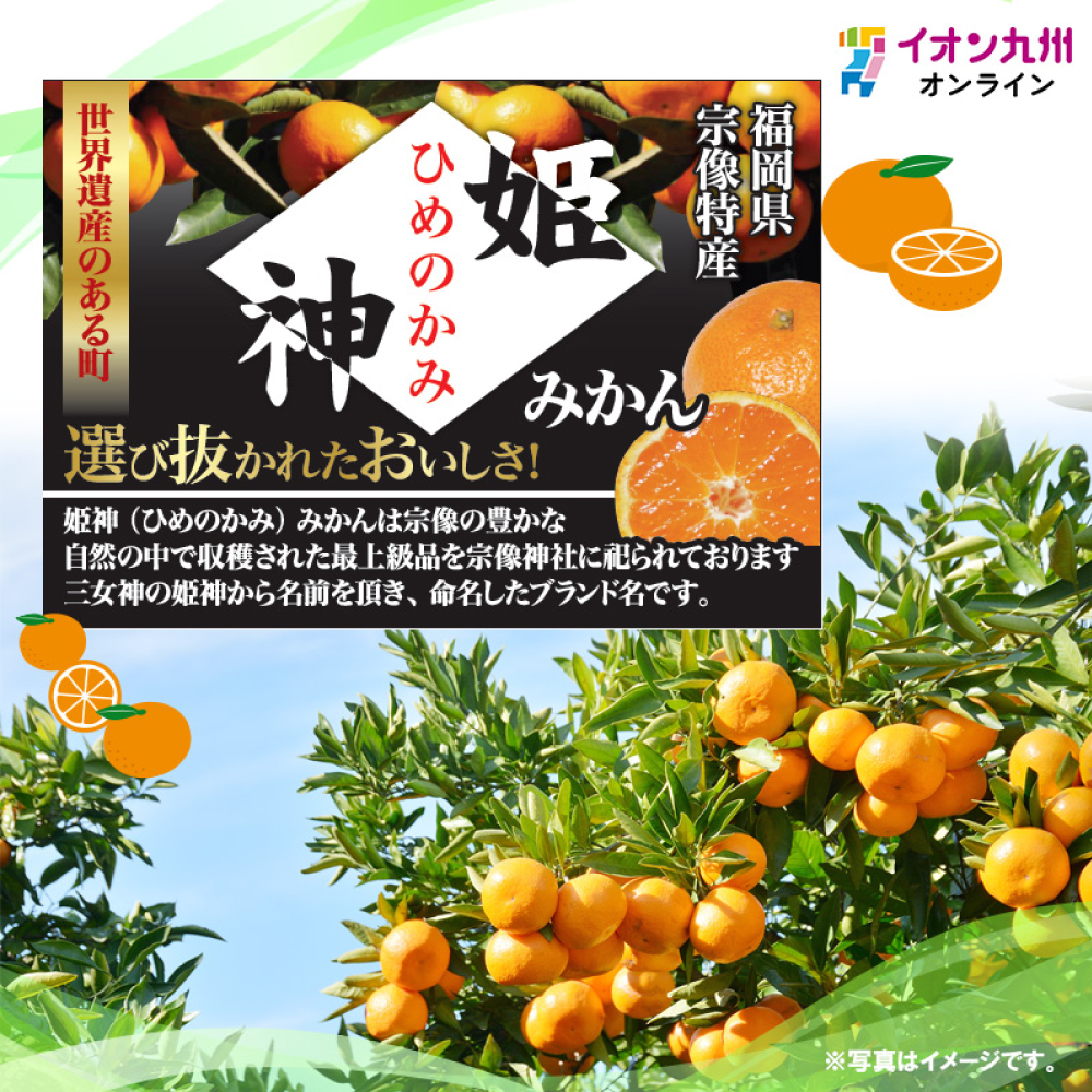 姫神(ひめのかみ)みかんは宗像の豊かな自然の中で収穫された最上級品を宗像大社に祀られております三女神の姫神から名前を頂き、命名したブランド名です。