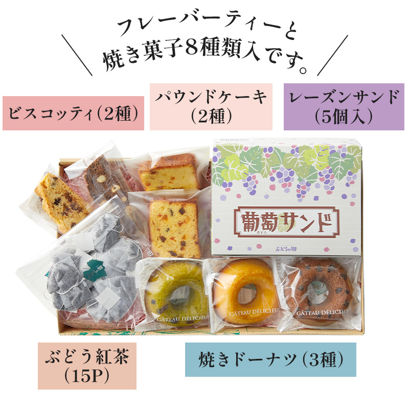 ぶどう紅茶(15P入)×1/ビスコッティ(2種)×各1/フルーツパウンド×1/オレンジパウンド×1/焼きドーナツ(3種)×各1/レーズンサンド(5個入り)×1