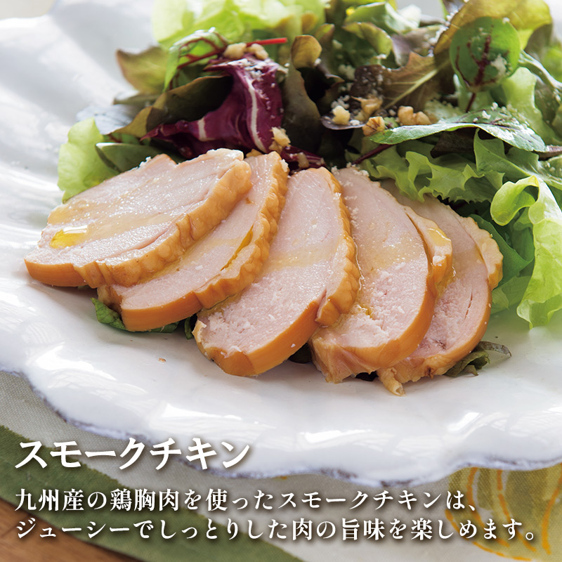 九州産の鶏胸肉を使って作るスモークチキンは、ジューシーでしっとりとした肉の旨味を楽しめます。