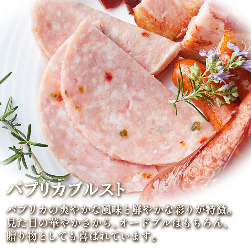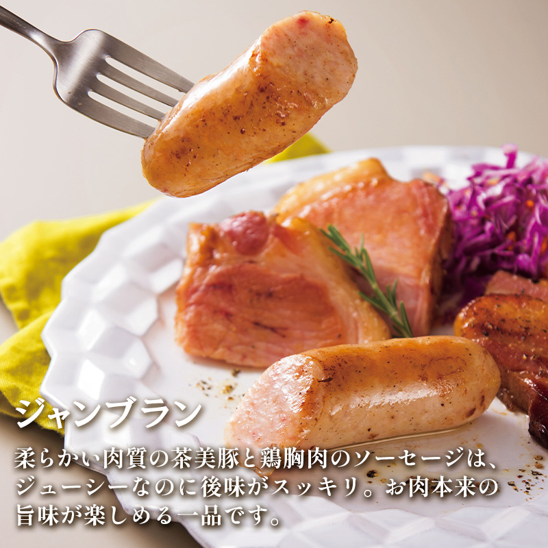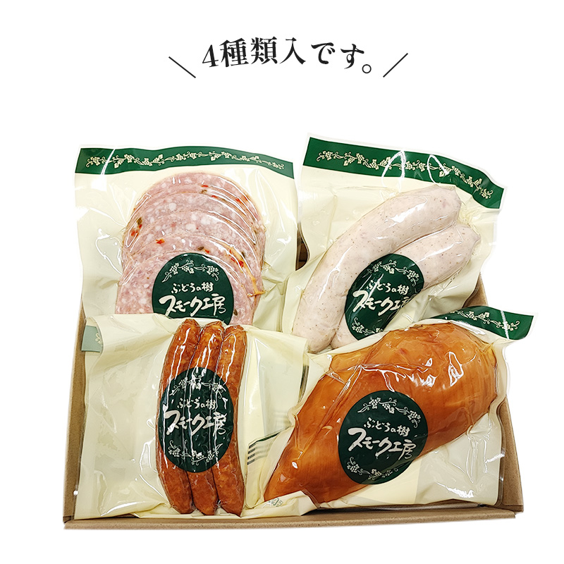 ソーセージ(78g)×1/スモークチキン(230g)×1/ジャンブラン(180g)×1/パプリカブルスト(100g)×1
