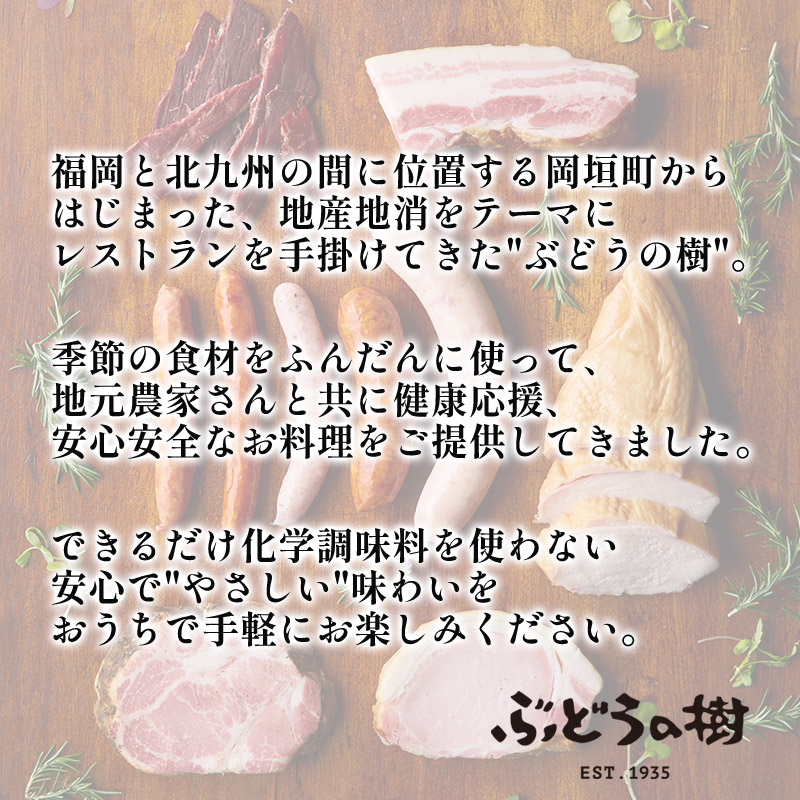 2022年IFFAドイツ食肉加工コンテスト金賞を獲得した、ソーセージ、スモークチキン、ジャンブラン、パプリカブルストが入った、スモーク工房の職人こだわりの「自家製スモーク4点セット」です。鹿児島県産のブランド豚『茶美豚(ちゃーみーとん)』や九州産の鶏を使い、職人の熟練した技とこだわりが存分に楽しめる贅沢な逸品は、ご自宅用としても、お子様・お孫様・大切な方への贈り物としても、多くの方からお喜びの声が届いています。