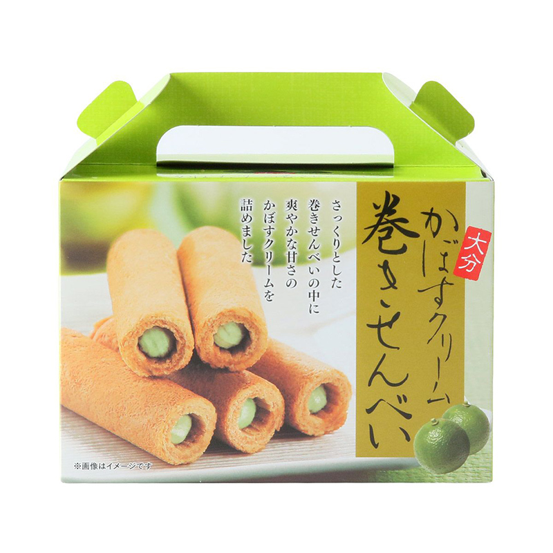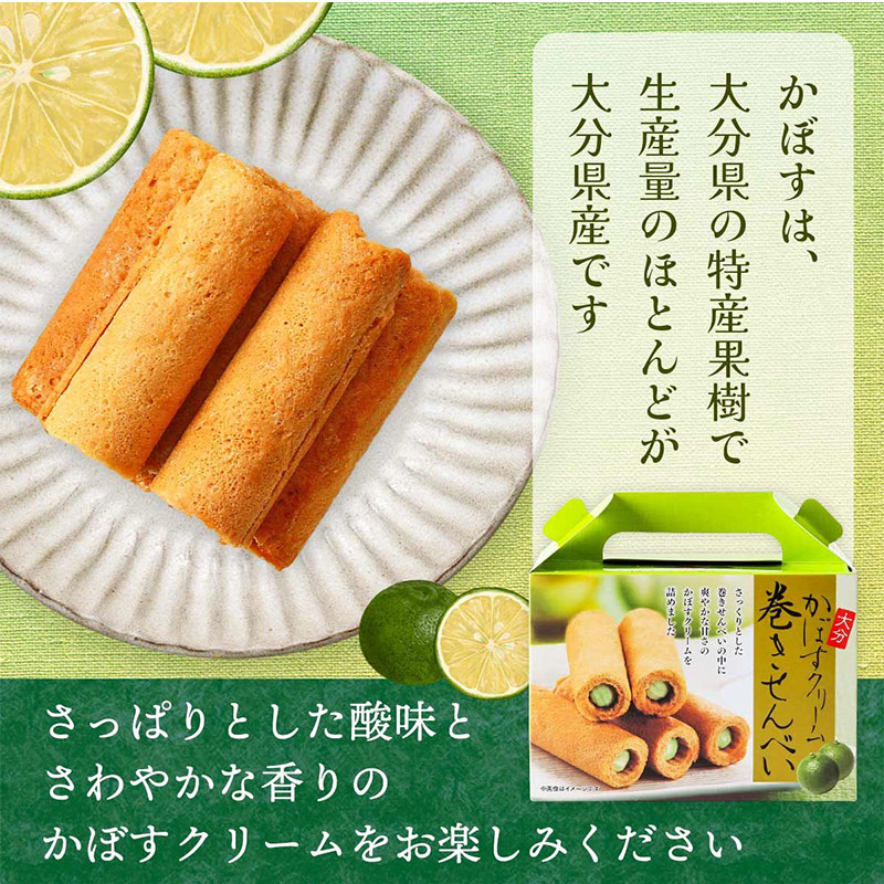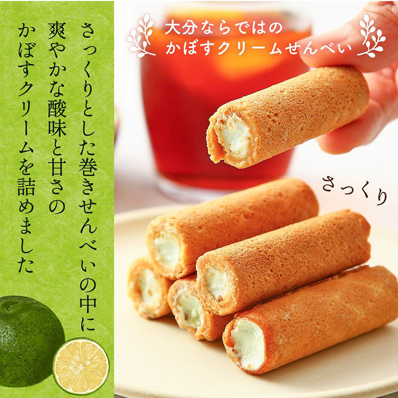 さっくりとした巻きせんべいの中に爽やかな酸味と甘さのかぼすクリームを詰めました。