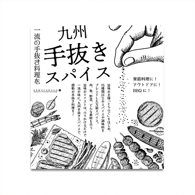 「九州手抜きスパイス」は、日本人に合う旨味テイストをテーマに、専門のマイスターが歳月をかけて完成させたプレミアムスパイス。そのおいしさの秘密は、旨味の最高峰「とらふぐ」をはじめ、厳選した15種以上のスパイス・調味料のスペシャルブレンド。肉料理・ステーキはもちろん、焼き鳥、魚介類、野菜など、どんな素材にも旨味を与えてくれます。食卓で忙しい夕食の調理に、アウトドア・BBQに、振りかけて調理するだけで簡単に名店レベルの一流料理に仕上がる「九州手抜きスパイス」で、一流の手抜き料理をお楽しみください。
