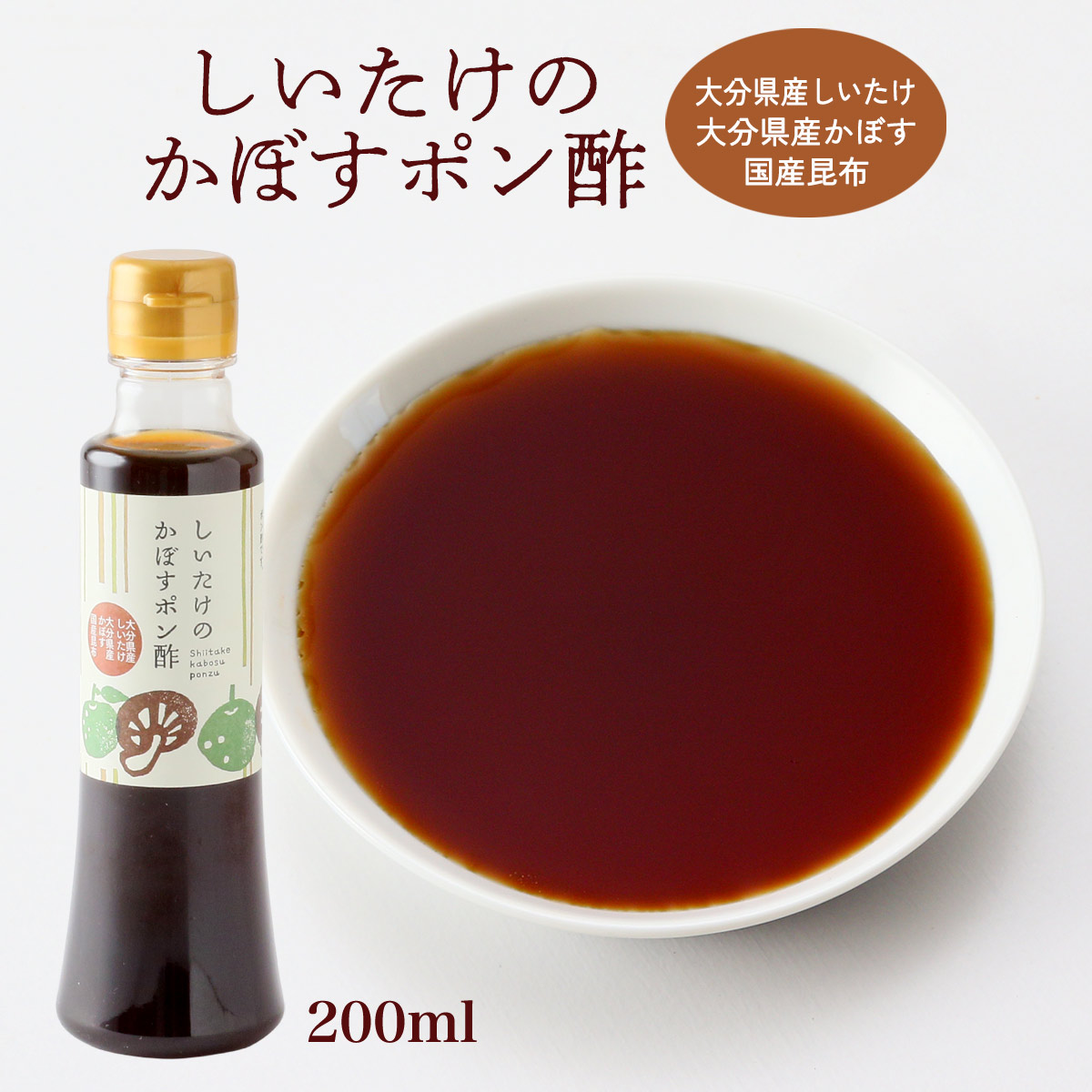 しょうゆ(大豆・小麦を含む、国内製造)、かぼす果汁(大分県産)、砂糖、醸造酢、こんぶエキス、食塩、乾燥しいたけ、酵母エキス