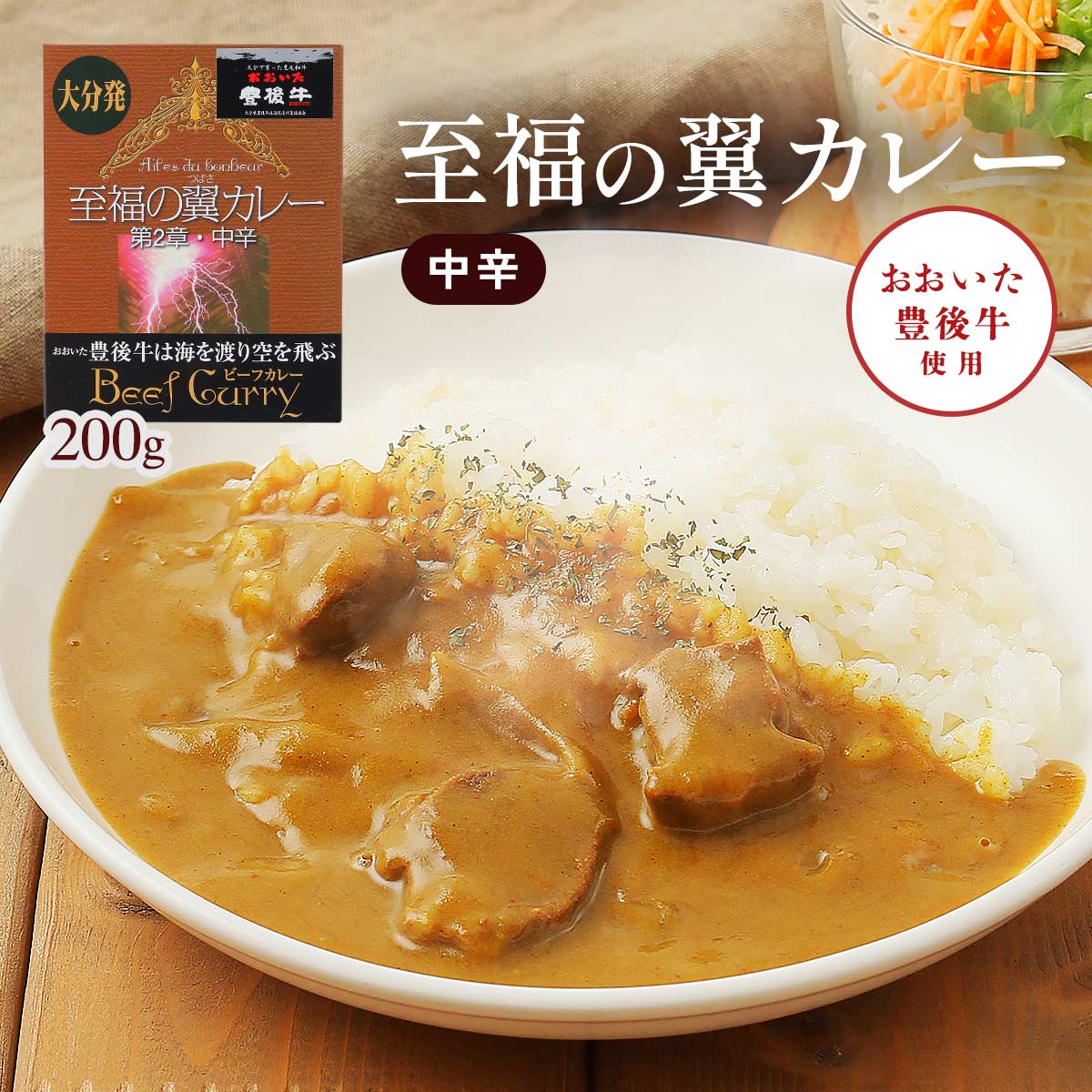 牛肉(大分県産)、ソテーオニオン、カレールウ、カレーペースト(ソテーオニオン、砂糖、水あめ、トマトピューレー、カレー粉、にんにくペースト、しょうがペースト、香辛料)、濃厚ソース、ソフリット(たまねぎ、にんじん、セロリ、大豆油)、ビーフエキス、小麦粉、たん白加水分解物、バター、香辛料、にんにくペースト、食塩/増粘剤(加工デンプン、グァーガム)、調味料(アミノ酸等)、カラメル色素、乳化剤、酸味料、香料、(一部に小麦、乳成分、牛肉、豚肉、ごま、大豆、りんごを含む)