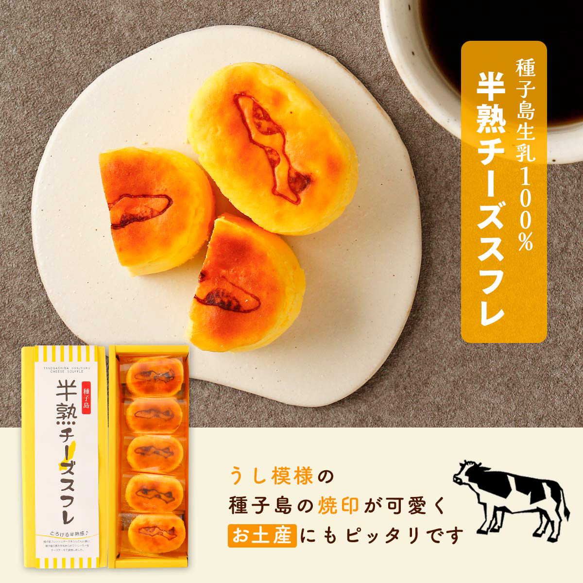 うし模様の種子島の焼印が可愛く、お土産にもピッタリの商品です。
