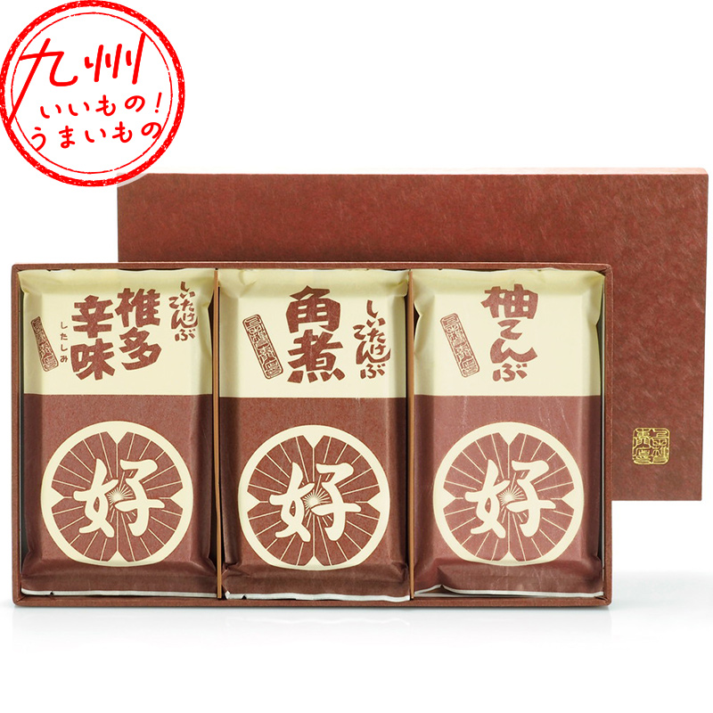 【角煮】大分産乾しいたけ、昆布、醤油(大豆、小麦由来)食塩、砂糖、味りん、食塩/保存料(ソルビン酸K)、調味料(アミノ酸等)、甘味料(甘草)、増粘多糖類、カラメル色素(一部に大豆・小麦を含む) 【椎茸こんぶ佃煮】乾しいたけ(大分県産)、昆布、水あめ、醤油、味りん、砂糖、食塩、七味唐辛子、山椒/保存料(ソルビン酸K)、調味料(アミノ酸等)、甘味料(甘草)、増粘多糖類、カラメル色素(一部に大豆・小麦を含む) 【柚こんぶ】昆布(北海道産)、醤油、砂糖、ゆず、水あめ/ソルビット、調味料(アミノ酸等)、カラメル色素、甘味料(甘草)、保存料(ソルビン酸K)、増粘多糖類(一部に大豆・小麦を含む)