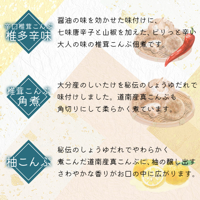 [セット内容]・椎茸こんぶ角煮:120g ・椎多辛味(したしみ)辛口椎茸こんぶ佃煮:120g ・柚こんぶ:120g