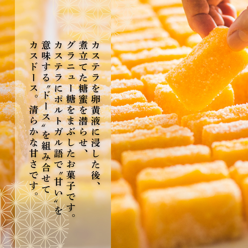 カステラにポルトガル語で甘いを意味するドースを組み合せてカスドース。清らかな甘さです。