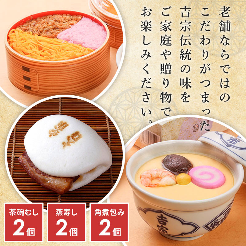 吉宗独自の夫婦蒸しと、老舗ならではの譲れないこだわりが生きた角煮包みをセットにしました。