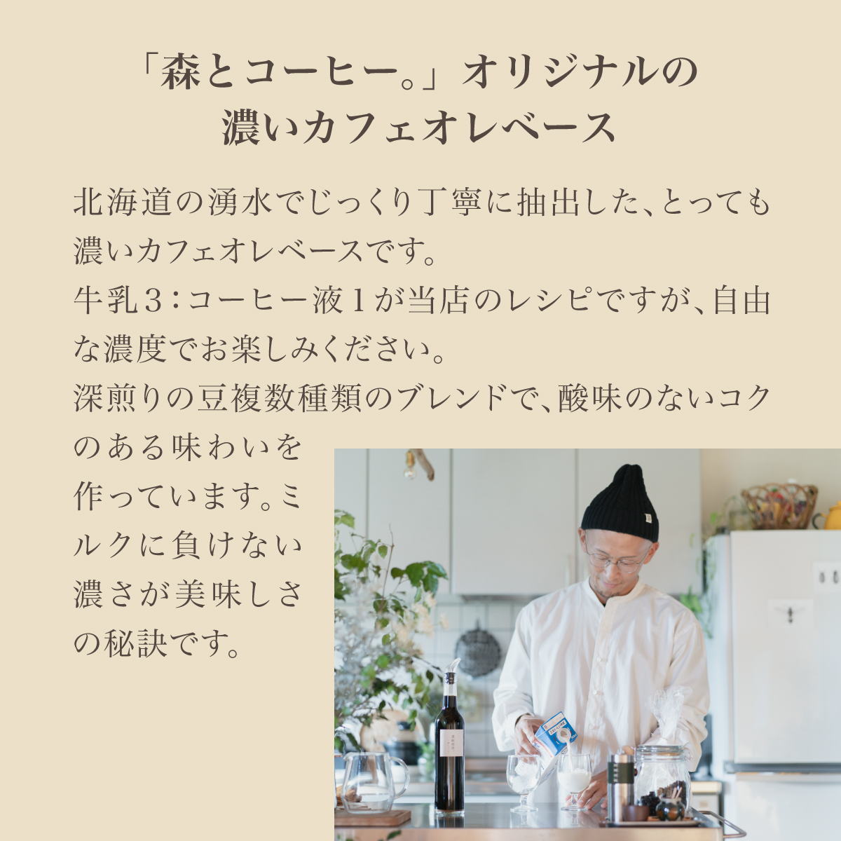 福岡県糸島の森の中の珈琲店「森とコーヒー。」の北海道の天然水で抽出した、とっても濃いカフェオレベース。