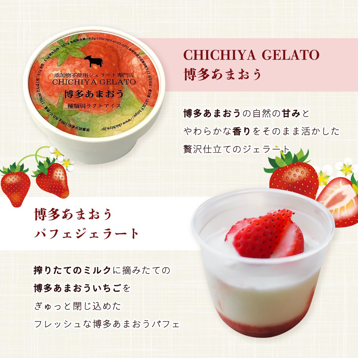 【博多あまおうパフェジェラート】牛乳(福岡県製造)、砂糖、いちご(福岡県産博多あまおう)、脱脂粉乳【博多あまおうジェラート】牛乳(福岡県製造)、グラニュー糖、博多あまおういちご(福岡県産)、脱脂粉乳