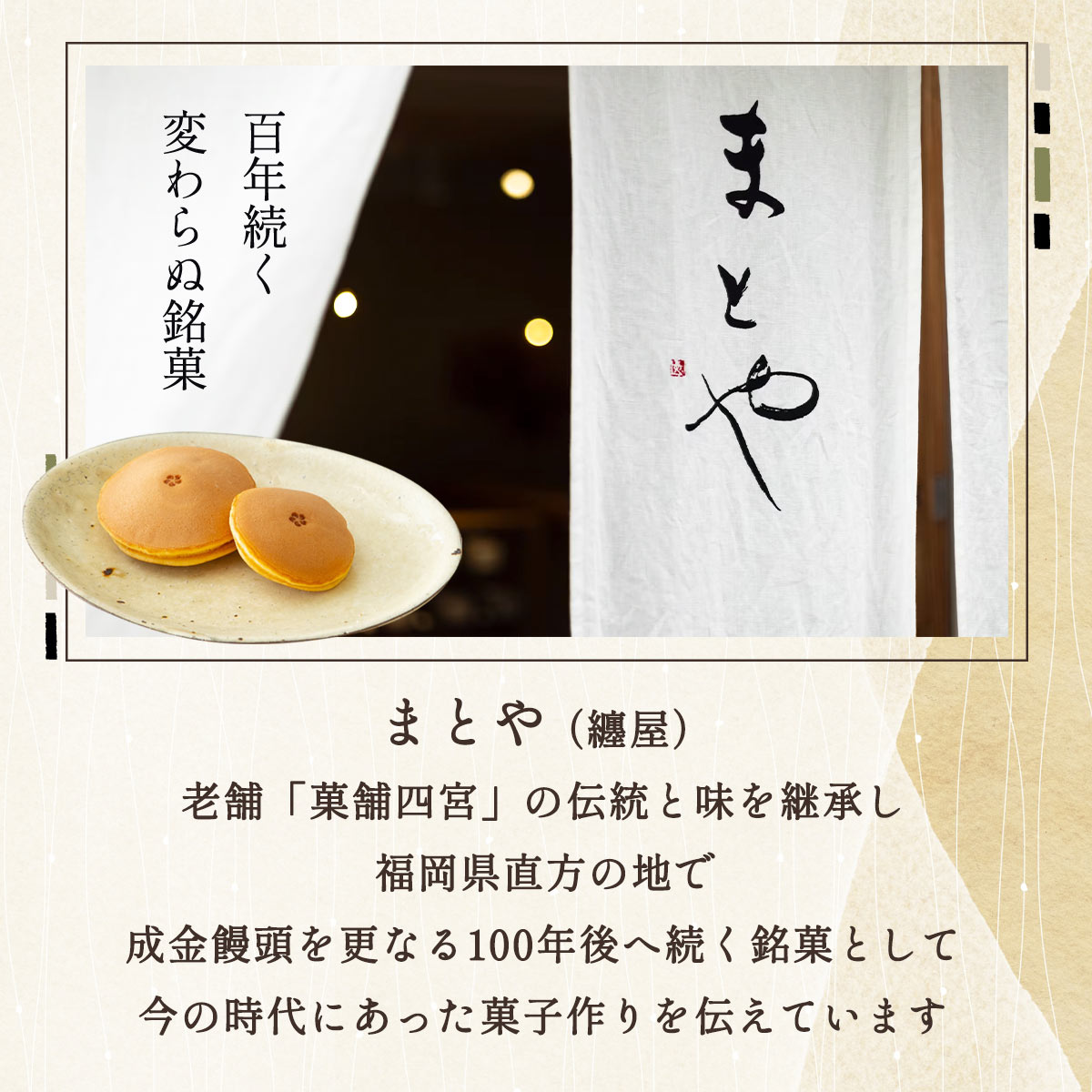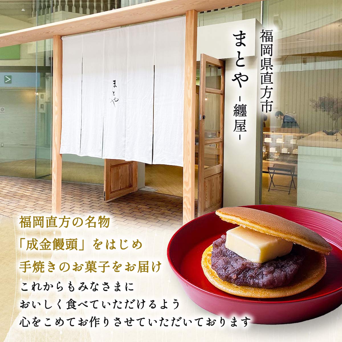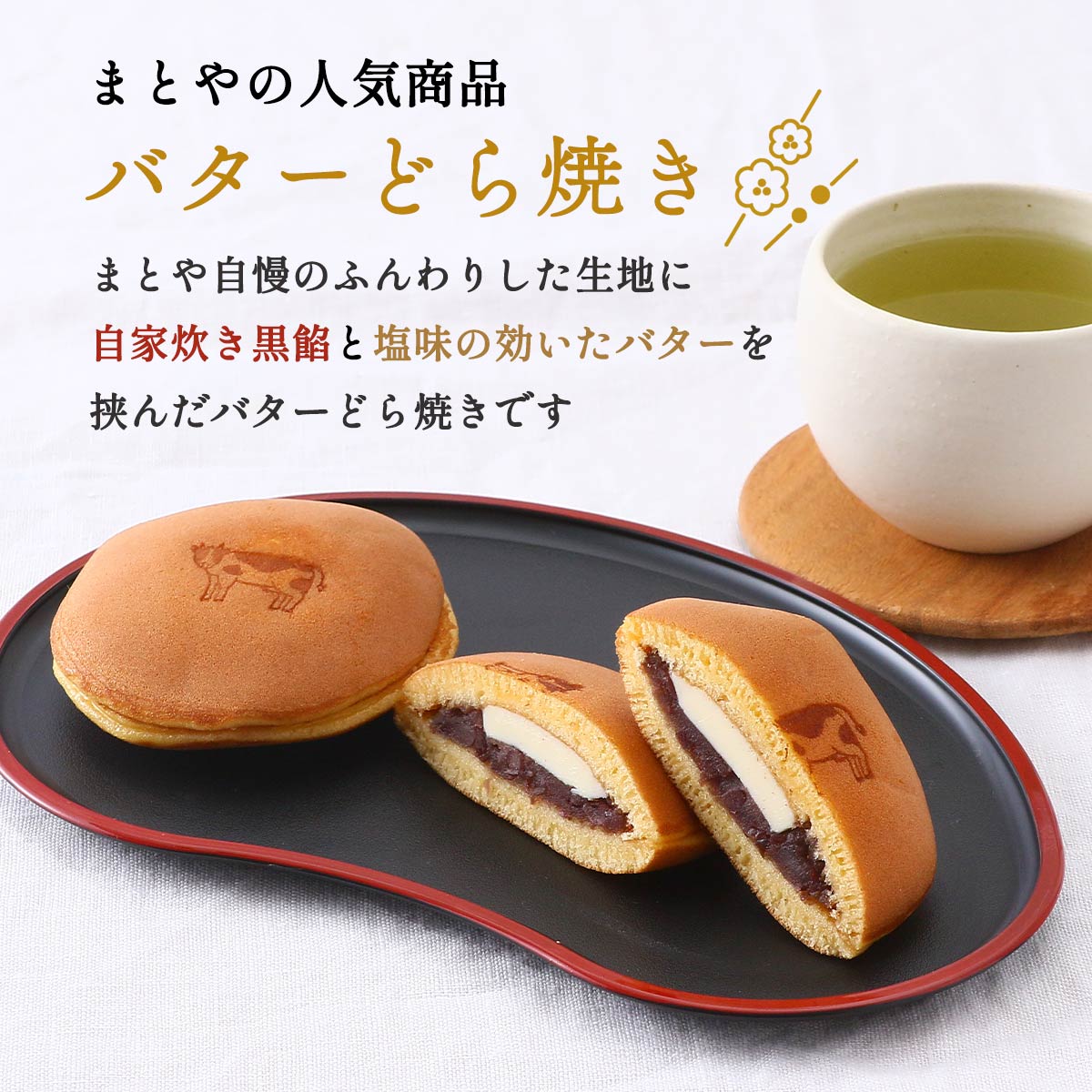 まとや自慢のふんわりした生地に、自家炊き黒餡と塩味の効いたバターを挟んだバターどら焼きです。