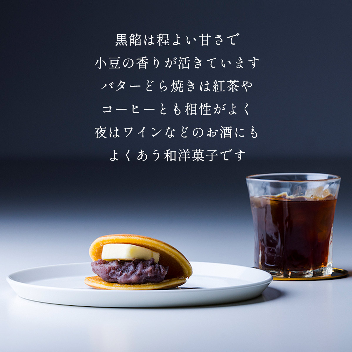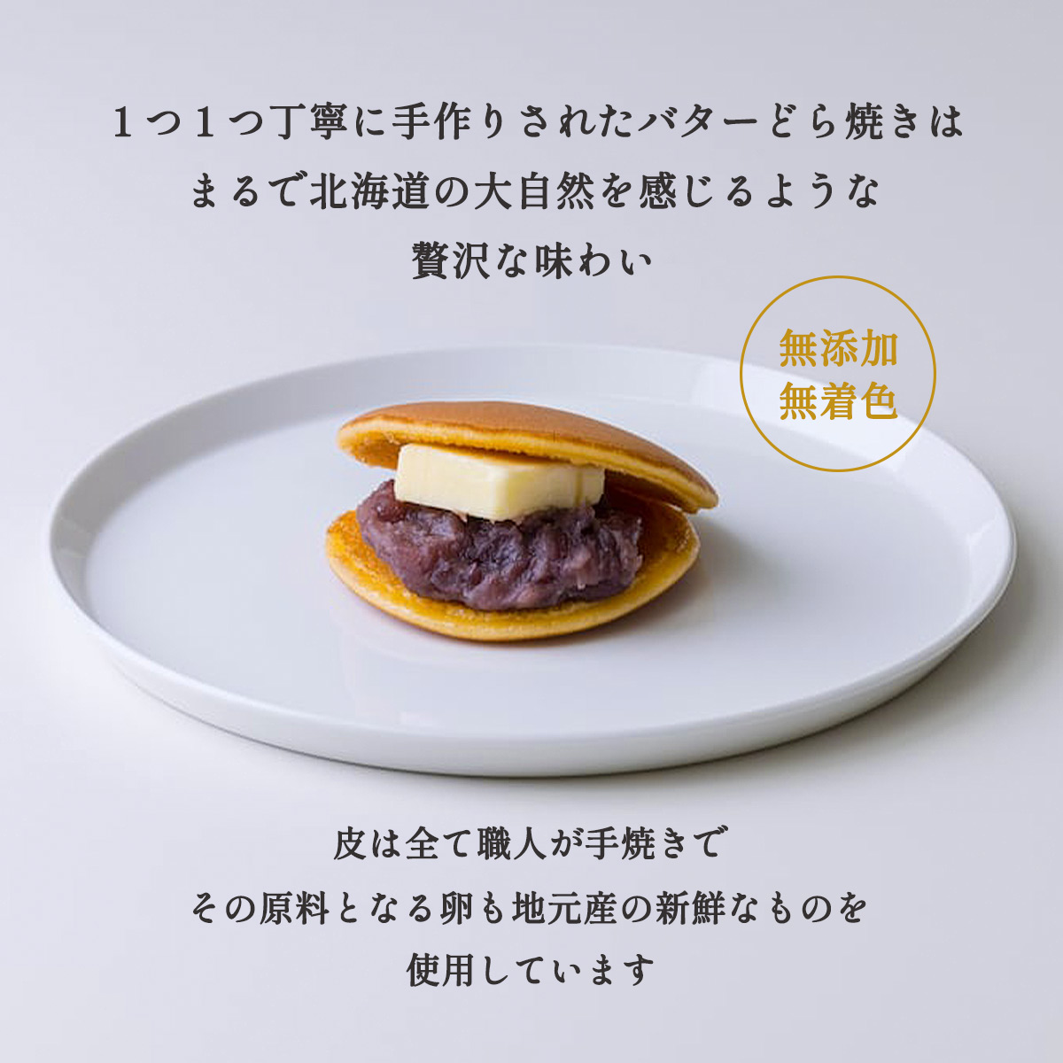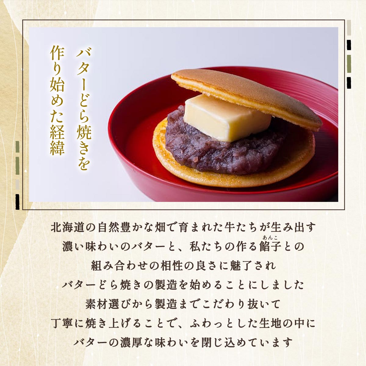 風味の良い粒餡と塩味のバターの心地よいミルク風味が広がる、しっとり、ふんわり食感のバターどら焼きです。
