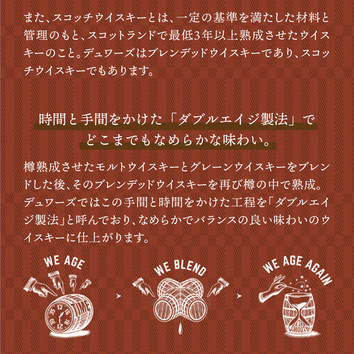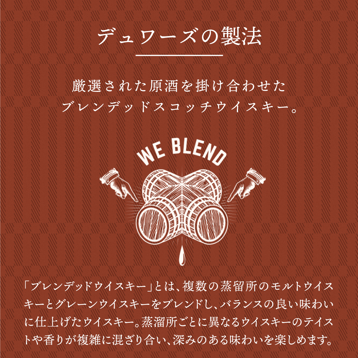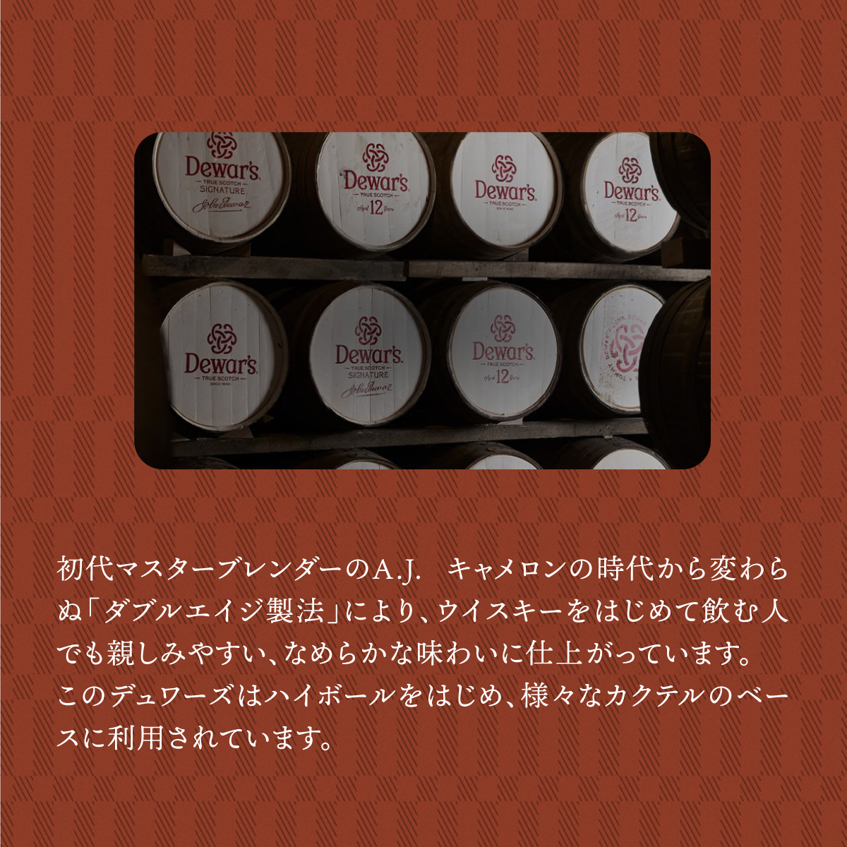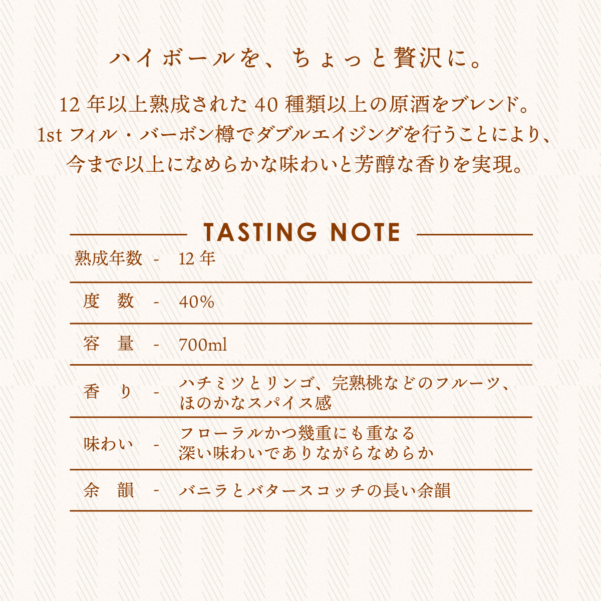 厳選された原酒を掛け合わせたブレンデッドスコッチウイスキー。12年以上熟成されたアバフェルディを中心とした40種類以上の原酒をブレンド。1st フィル・バーボン樽でダブルエイジングを行うことにより、今まで以上になめらかな味わいと芳醇な香りを実現。