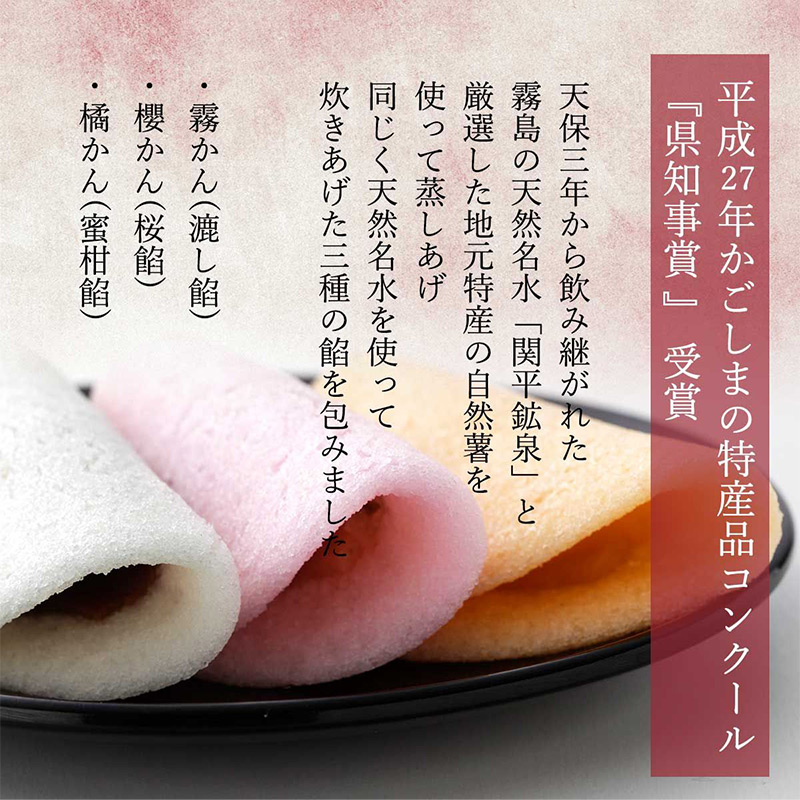 天保三年から飲み継がれた霧島の天然名水「関平鉱泉」と、厳選した地元特産の自然薯を使って蒸しあげ、同じく天然名水を使って炊きあげた三種の餡を包みました。