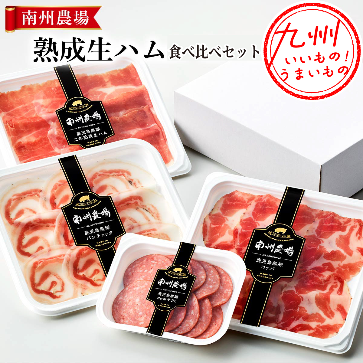 【生ハム】黒豚モモ肉(鹿児島県産)、食塩【パンチェッタ】黒豚バラ肉(鹿児島県産)、食塩、砂糖、香辛料/発色剤(亜硝酸Na)【コッパ】黒豚肩肉(鹿児島県産)、香辛料、砂糖、食塩/発色剤(亜硝酸Na)【コッホサラミ】畜肉(黒豚肉(鹿児島県産)、牛肉(鹿児島県産))、食塩、香辛料/リン酸塩(Na、K)、酸化防止剤(V.C)、発色剤(亜硝酸Na)