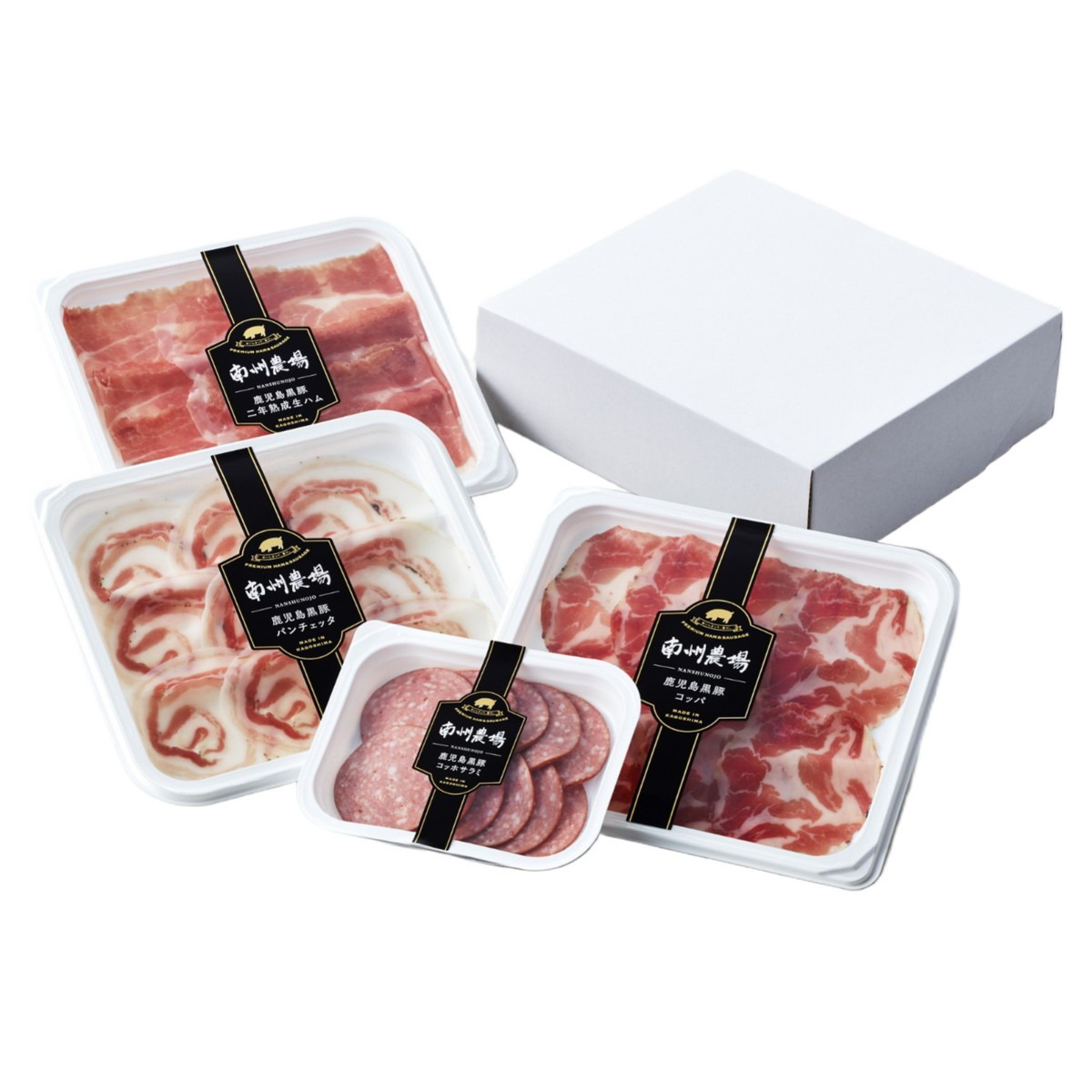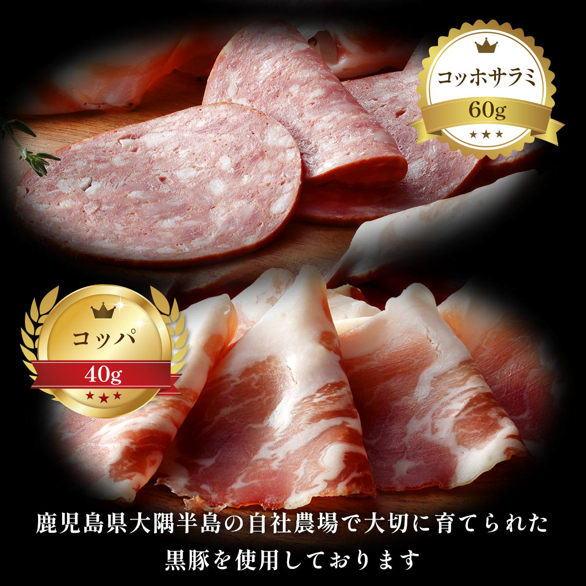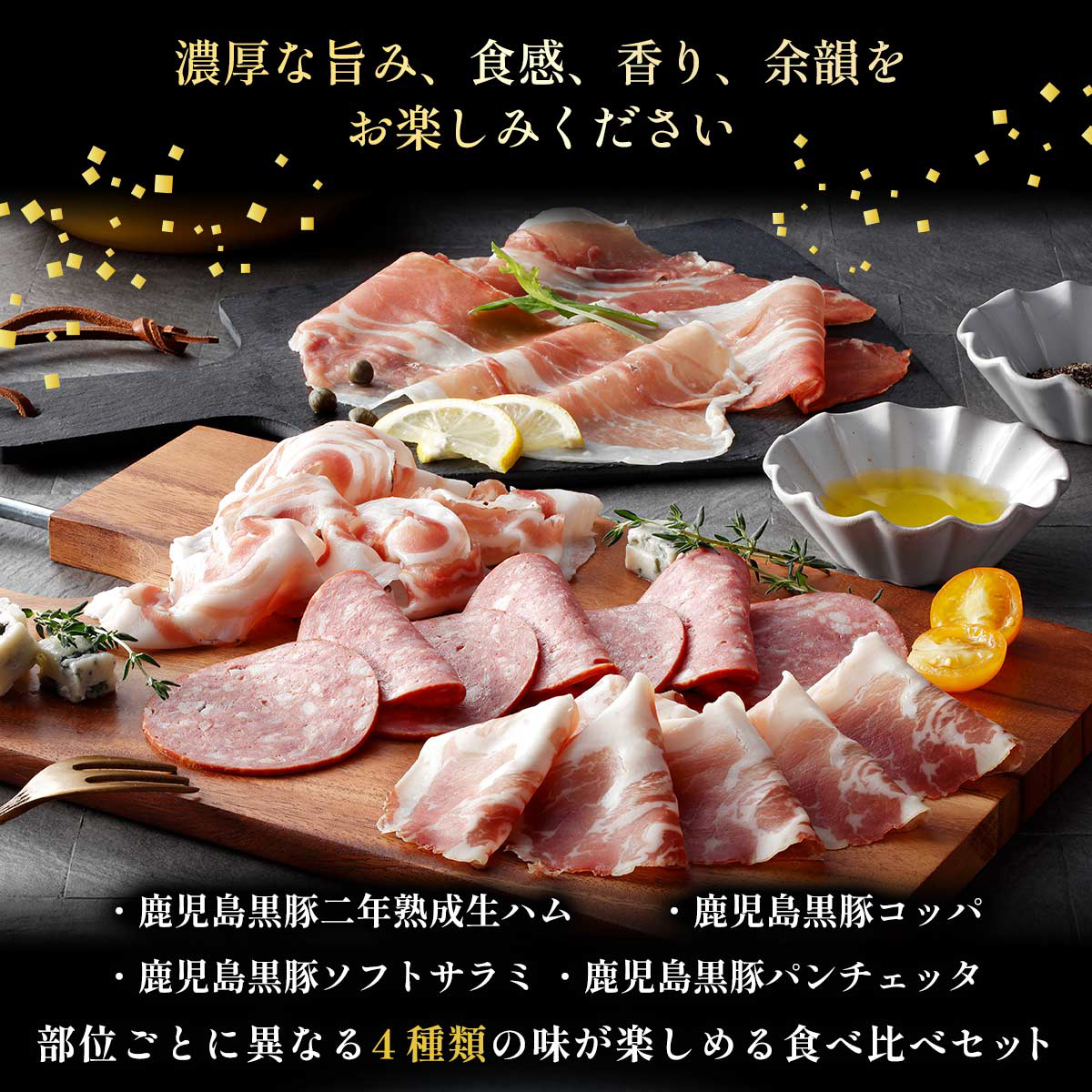 鹿児島県大隅半島の自社農場で大切に育てられた黒豚モモ肉の2年熟成生ハム、肩ロースのコッパ、バラ肉のパンチェッタ、黒豚と黒毛和牛のソフトサラミと、部位ごとに異なる4種類の味わいが楽しめる食べ比べセットです。