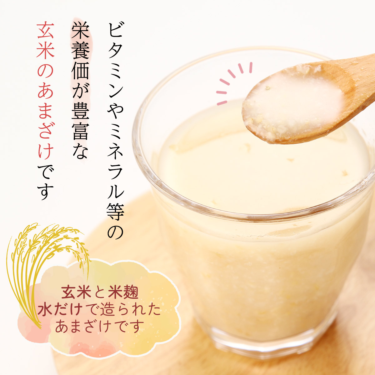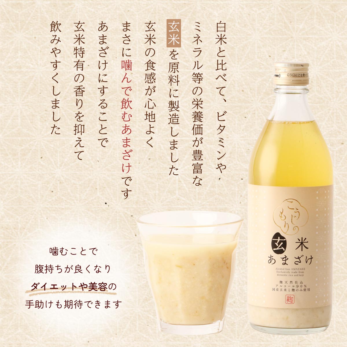 あまざけにすることで、玄米特有の香りを抑えて飲みやすくしました。