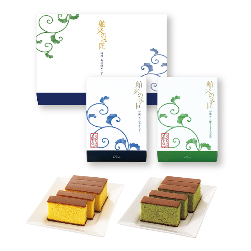 「ハチミツの女王」と呼ばれる国産のアカシア蜂蜜を使った「舶来の匠 蜂蜜カステラ」と八女市星野村の玉露を使用した「舶来の匠 玉露カステラ」の詰合せです。