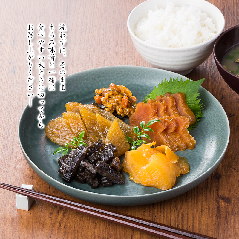 茄子はひとつひとつ手作業で皮をむき、味付けしております。もろみ味噌と一緒に食べやすい大きさに切ってからお召し上がりください。