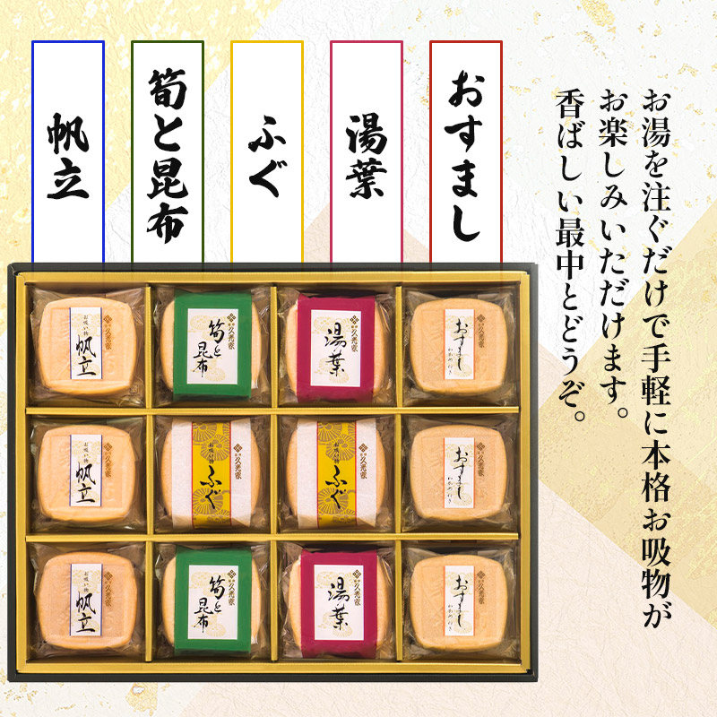 【帆立】乾燥スープ(国内製造(デキストリン、ボイルほたて貝柱、みつば、食塩、かつお節エキス、酵母エキスパウダー、その他))、うきみ(最中の皮(もち米))/増粘剤(キサンタンガム)、酸化防止剤(ビタミンE)、(一部に小麦・大豆を含む) 【おすまし】乾燥スープ(国内製造(デキストリン、食塩、かつお節エキス、酵母エキスパウダー、その他))、うきみ(最中の皮(もち米))/増粘剤(キサンタンガム)、酸化防止剤(ビタミンE)、(一部に小麦・大豆を含む) 【ふぐ】乾燥スープ(国内製造(デキストリン、ふぐ(標準和名:しろさばふぐ)、みつば、食塩、魚介エキス、かつお節エキス、その他))、うきみ(最中の皮(もち米))/増粘剤(キサンタンガム)、酸化防止剤(ビタミンE)、(一部に小麦・大豆を含む) 【筍と昆布】乾燥スープ(国内製造(たけのこ水煮、デキストリン、みつば、食塩、かつお節エキス、こんぶ、しょうゆ、酵母エキスパウダー))、うきみ(最中の皮(もち米))/増粘剤(キサンタンガム)、酸化防止剤(ビタミンE)、(一部に小麦・大豆を含む) 【湯葉】乾燥スープ(国内製造(デキストリン、ゆば、かつお節エキス、食塩、その他))、うきみ(最中の皮(もち米))/増粘剤(キサンタンガム)、酸化防止剤(ビタミンE)、(一部に小麦・大豆を含む)
