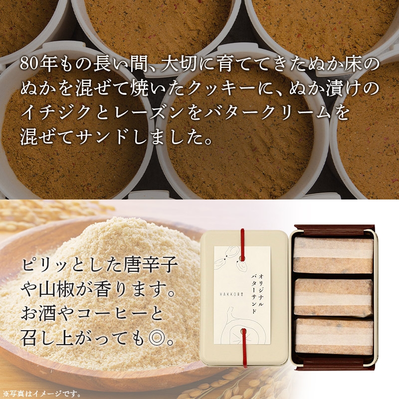 80年もの長い歴史をもったぬか床の『ぬか』を混ぜて焼いたクッキーにぬか漬けのイチジクとレーズンをバタークリームと混ぜサンドしました。