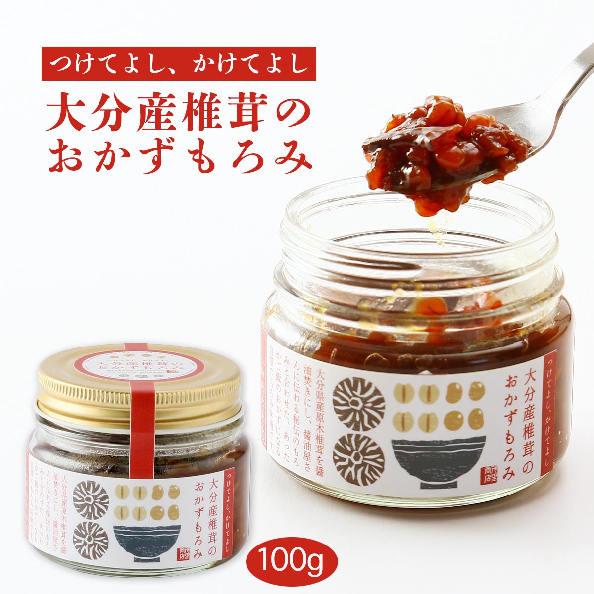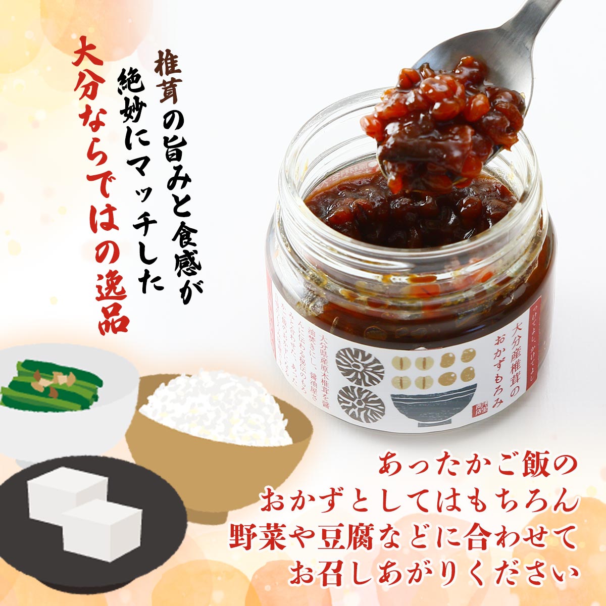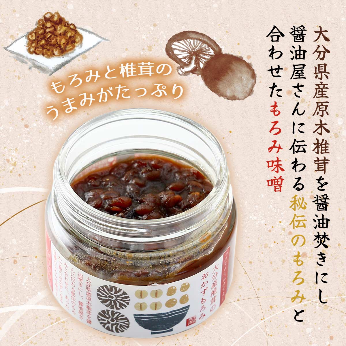 大分県産原木椎茸を醤油焚きにし、醤油屋さんに伝わる秘伝のもろみと合わせたあったかご飯のおかずになるもろみ味噌。