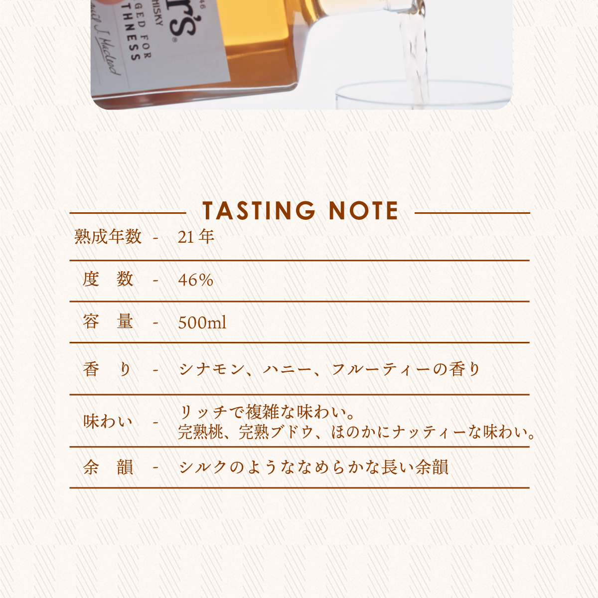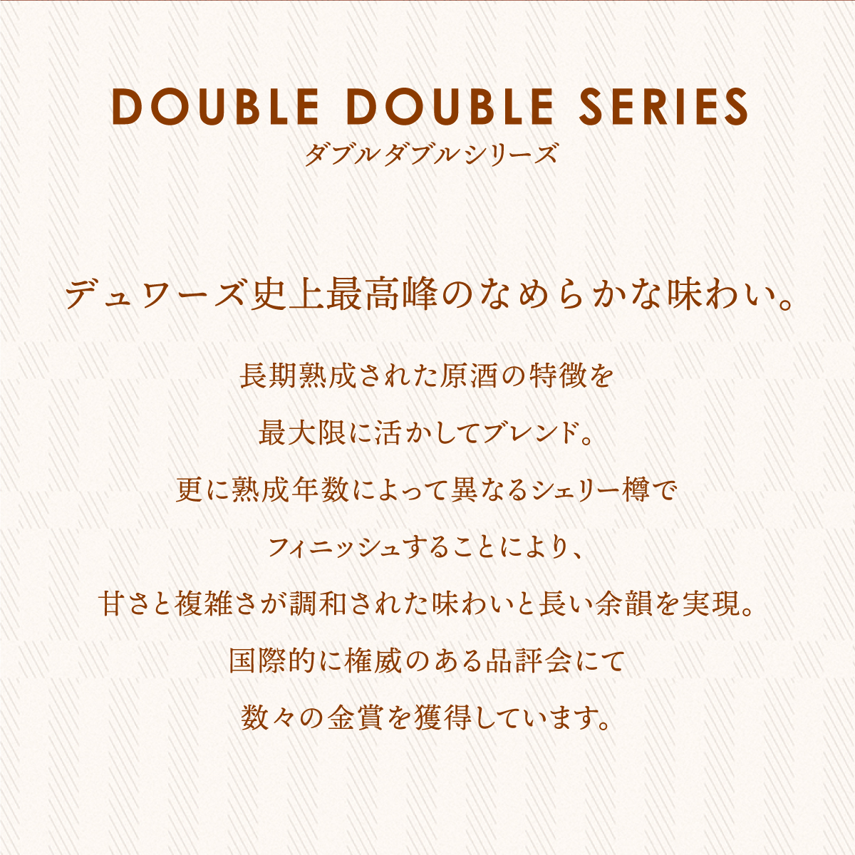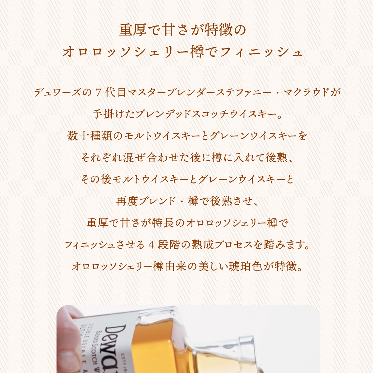 デュワーズの7代目マスターブレンダーステファニー・マクラウドが手掛けたブレンデッドスコッチウイスキー。数十種類のモルトウイスキーとグレーンウイスキーをそれぞれ混ぜ合わせた後に樽に入れて後熟、その後モルトウイスキーとグレーンウイスキーと再度ブレンド・樽で後熟させ、重厚で甘さが特長のオロロッソシェリー樽でフィニッシュさせる4段階の熟成プロセスを踏みます。